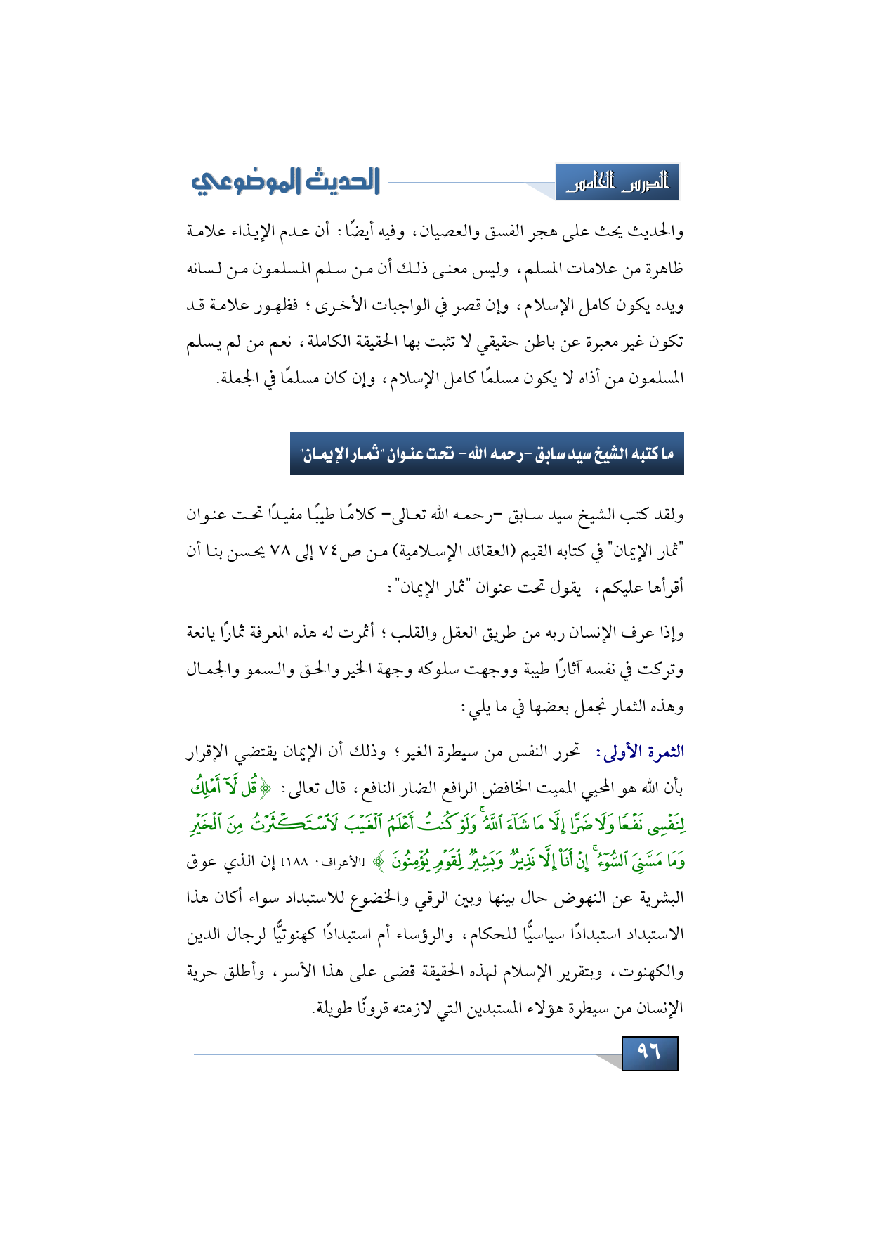 ما كتبه الشيخ سيد سابق -رحمه الله- تحت عنوان "ثمار الإيمان"