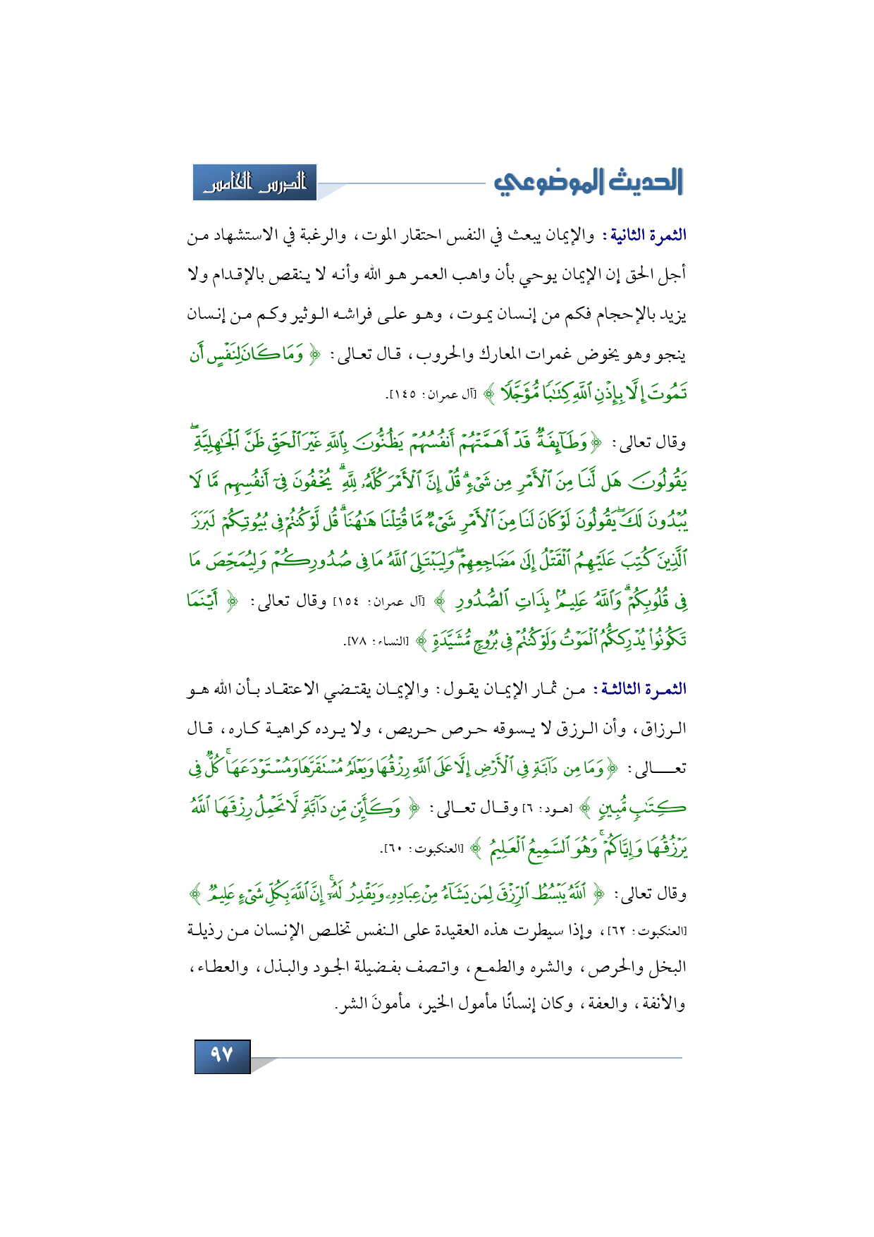 الثمرة الثالثة من ثمار الإيمان يقول: والإيمان يقتضي الاعتقاد بأن الله هو الرزاق، وأن الرزق لا يسوقه حرص حريص، ولا يرده كراهية كاره، قال تعالى: {وَمَا مِنْ دَابَّةٍ فِي الأَرْضِ إِلاَّ عَلَى اللَّهِ رِزْقُهَا وَيَعْلَمُ مُسْتَقَرَّهَا وَمُسْتَوْدَعَهَا كُلٌّ فِي كِتَابٍ مُبِينٍ} (هود: 6) وقال تعالى: {وَكَأَيِّن مِنْ دَابَّةٍ لا تَحْمِلُ رِزْقَهَا اللَّهُ يَرْزُقُهَا وَإِيَّاكُمْ وَهُوَ السَّمِيعُ الْعَلِيمُ} (العنكبوت: 60).