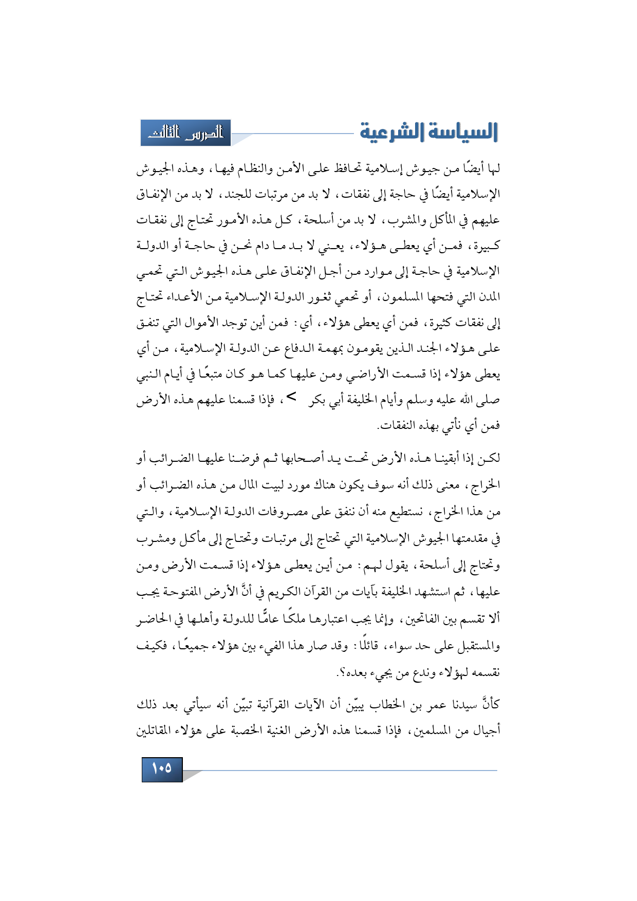 لها أيضًا من جيوش إسلامية تحافظ على الأمن, والنظام فيها, وهذه الجيوش الإسلامية أيضًا في حاجة إلى نفقات, لا بد من مرتبات للجند, لا بد من الإنفاق عليهم في المأكل والمشرب, لا بد من أسلحة, كل هذه الأمور تحتاج إلى نفقات كبيرة, فمن أي يعطى هؤلاء, يعني لا بد ما دام نحن في حاجة أو الدولة الإسلامية في حاجة إلى موارد من أجل الإنفاق على هذه الجيوش التي تحمي المدن التي فتحها المسلمون أو تحمي ثغور الدولة الإسلامية من الأعداء تحتاج إلى نفقات كثيرة, فمن أي يعطى هؤلاء, أي: فمن أين توجد الأموال التي تنفق على هؤلاء الجند الذين يقومون بمهمة الدفاع عن الدولة الإسلامية, من أي يعطى هؤلاء إذا قسمت الأرضون ومن عليها, يعني: يقول إذا قسمنا هذه الأرض بين المقاتلين كما هو كان متبعًا في أيام النبي صلى الله عليه وسلم وأيام الخليفة أبو بكر -رضوان الله تبارك وتعالى عليه- فإذا قسمنا عليهم هذه الأرض فمن أي نأتي بهذه النفقات.