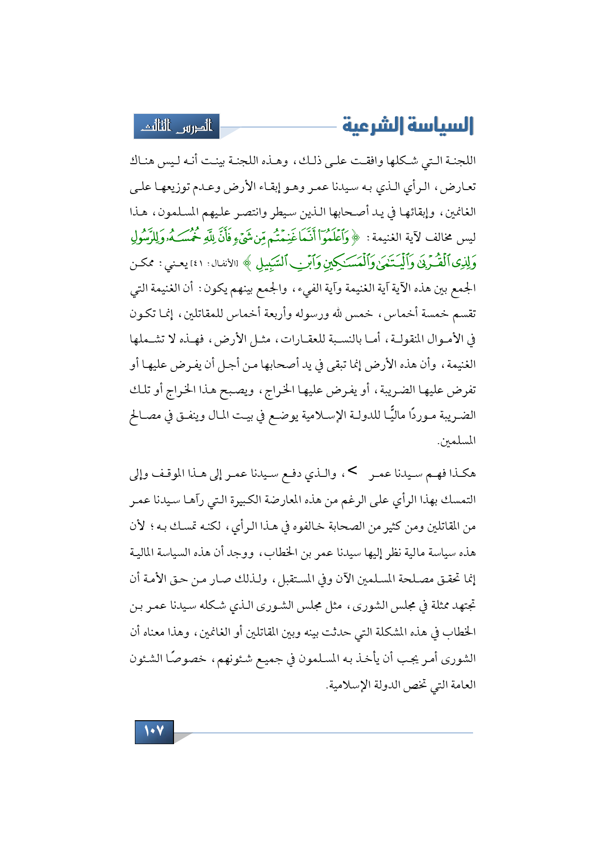 كما قلنا اللجنة التي شكلها وافقت على ذلك, وهذه اللجنة بينت أنه ليس هناك تعارض, الرأي الذي به سيدنا عمر وهو إبقاء الأرض وعدم توزيعها على الغانمين وإبقائها في يد أصحابها الذين سيطر وانتصر عليهم المسلمون, هذا ليس مخالف لآية الغنيمة: {وَاعْلَمُوا أَنَّمَا غَنِمْتُمْ مِنْ شَيْءٍ فَأَنَّ لِلَّهِ خُمُسَهُ} يعني: ممكن الجمع بين هذه الآية آية الغنيمة وآية الفيء, والجمع بينهم يكون: أن الغنيمة التي تقسم خمسة أخماس, خمس لله ورسوله وأربعة أخماس للمقاتلين, إنما تكون في الأموال المنقولة أما بالنسبة للعقارات, مثل الأرض, فهذه لا تشملها الغنيمة وأن هذه الأرض إنما تبقى في يد أصحابها من أجل أن يفرض عليها أو تفرض عليها الضريبة أو يفرض عليها الخراج, ويصبح هذا الخراج أو تلك الضريبة موردًا ماليًا للدولة الإسلامية يوضع في بيت المال وينفق في مصالح المسلمين.