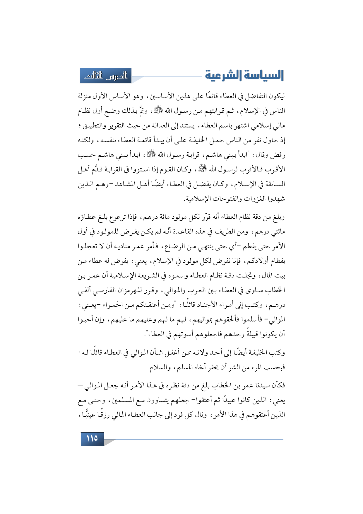 ليكون التفاضل في العطاء قائمًا على هذين الأساسين, وهو الأساس الأول منزلة الناس في الإسلام، ثم قرابتهم من رسول الله -صلى الله عليه وسلم- وتم بذلك وضع أول نظام مالي إسلامي اشتهر باسم العطاء, يستند إلى العدالة من حيث التقرير والتطبيق؛ إذ حاول نفر من الناس حمل الخليفة على أن يبدأ قائمة العطاء بنفسه, ولكنه رفض وقال: "أبدأ ببني هاشم, قرابة رسول الله -صلى الله عليه وسلم- أبدأ ببني هاشم حسب الأقرب فالأقرب لرسول الله -صلى الله عليه وسلم- وكان القوم إذا استووا في القرابة قدم أهل السابقة في الإسلام, وكان يفضل في العطاء أيضًا أهل المشاهد -وهم الذين شهدوا الغزوات والفتوحات الإسلامية.