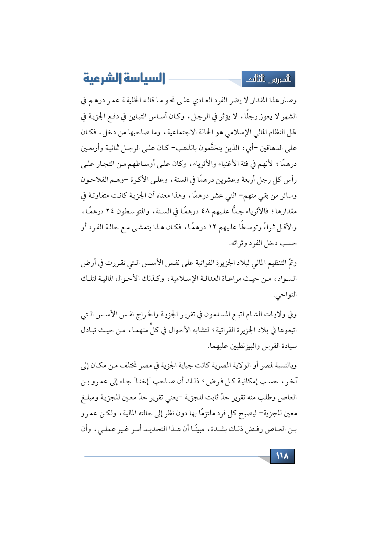 وصار هذا المقدار لا يضر الفرض العادي على نحو ما قاله الخليفة عمر درهم في الشهر لا يعوز رجلًا, لا يؤثر في الرجل, وكان أساس التباين في دفع الجزية في ظل النظام المالي الإسلامي هو الحالة الاجتماعية, وما صاحبها من دخل, فكان على الدهاقين -أي: الذين يتختمون بالذهب- كان على الرجل ثمانية وأربعين درهمًا؛ لأنهم في فئة الأغنياء والأثرياء, وكان على أوساطهم من التجار على رأس كل رجل أربعة وعشرين درهمًا في السنة, وعلى الأكرة -وهم الفلاحون وسائر من بقي منهم- اثن عشر درهمًا, وهذا معناه أن الجزية كانت متفاوتة في مقدارها فالأثرياء جدًّ عليهم 48 درهمًا في السنة، والمتوسطون 24 درهمًا، والأقل ثراءً وتوسطً عليهم 12 درهمًا, فكان هذا يتمشى مع حالة الفرد أو حسب دخل الفرد وثرائه.