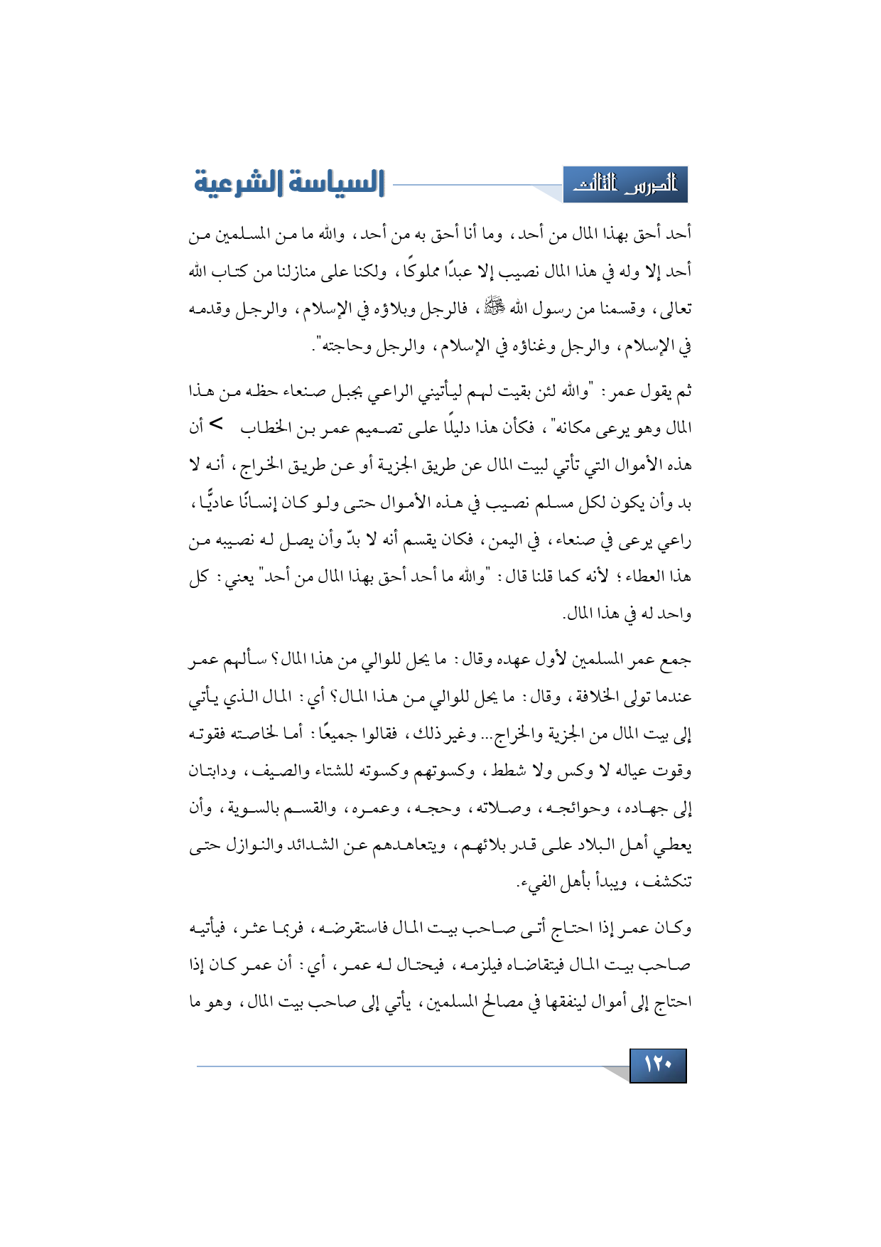 أحد أحق بهذا المال من أحد، وما أنا أحق به من أحد, والله ما من المسلمين من أحد إلا وله في هذا المال نصيب إلا عبدًا مملوكًا, ولكنا على منازلنا من كتاب الله تعالى وقسمنا من رسول الله -صلى الله عليه وسلم- فالرجل وبلاؤه في الإسلام، والرجل وقدمه في الإسلام، والرجل وغناؤه في الإسلام، والرجل وحاجته".