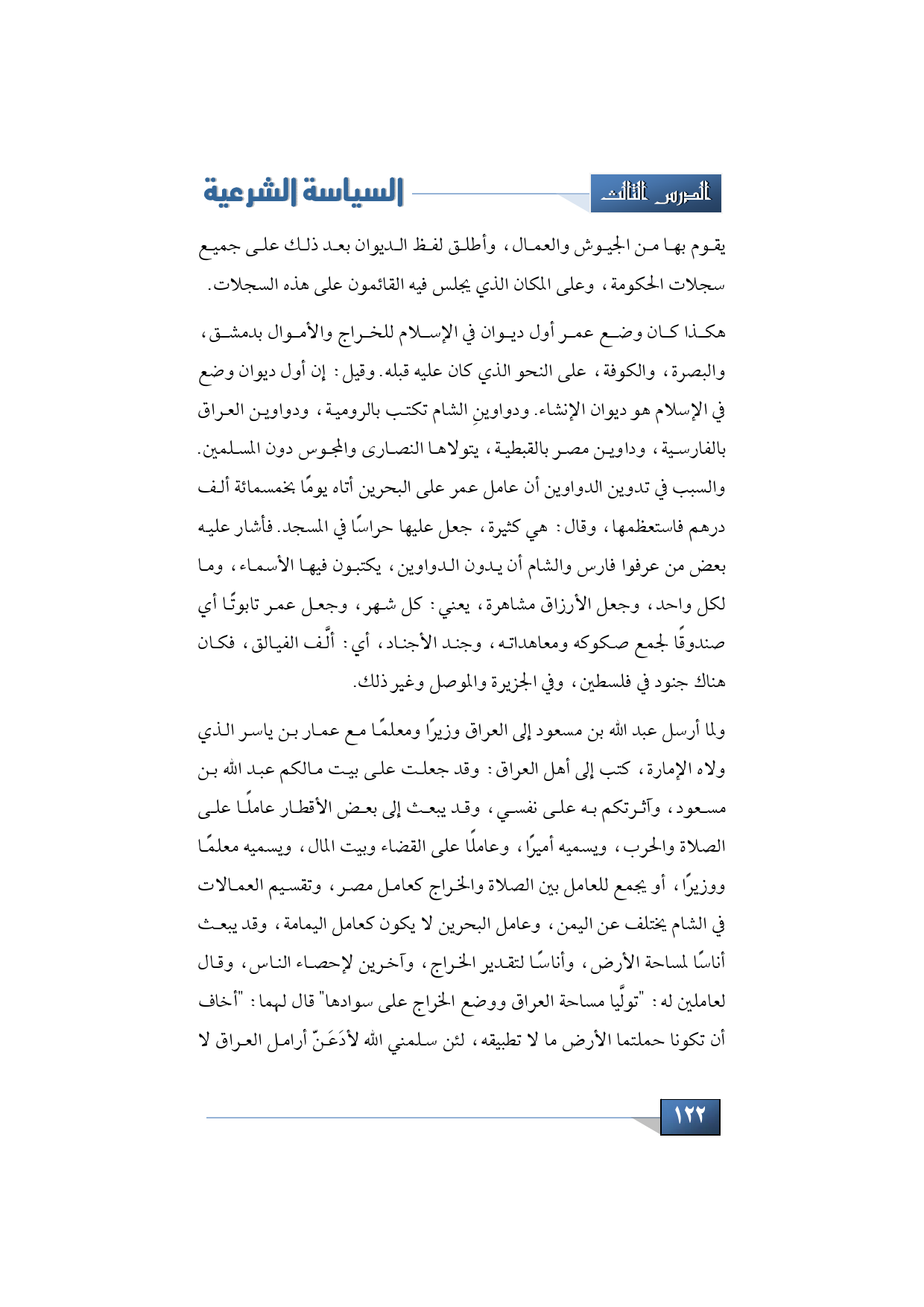 ولما أرسل عبد الله بن مسعود إلى العراق وزيرًا ومعلمًا مع عمار بن ياسر الذي ولاه الإمارة كتب إلى أهل العراق, وقد جعلت على بيت مالكم عبد الله بن مسعود, وآثرتكم به على نفسي, وقد يبعث إلى بعض الأقطار عاملًا على الصلاة والحرب، ويسميه أميرًا, وعاملًا على القضاء وبيت المال، ويسميه معلمًا ووزيرًا, أو يجمع للعامل بين الصلاة والخراج كعامل مصر, وتقسيم العمالات في الشام يختلف عن اليمن، وعامل البحرين لا يكون كعامل اليمامة, وقد يبعث أناسًا لمساحة الأرض، وأناسًا لتقدير الخراج، وآخرين لإحصاء الناس, وقال لعاملين له: "توليا مساحة العراق ووضع الخراج على سوادها" قال لهما: "أخاف أن تكونا حملتما الأرض ما لا تطبيقه, لئن سلمني الله لأدعنّ أرامل العراق لا