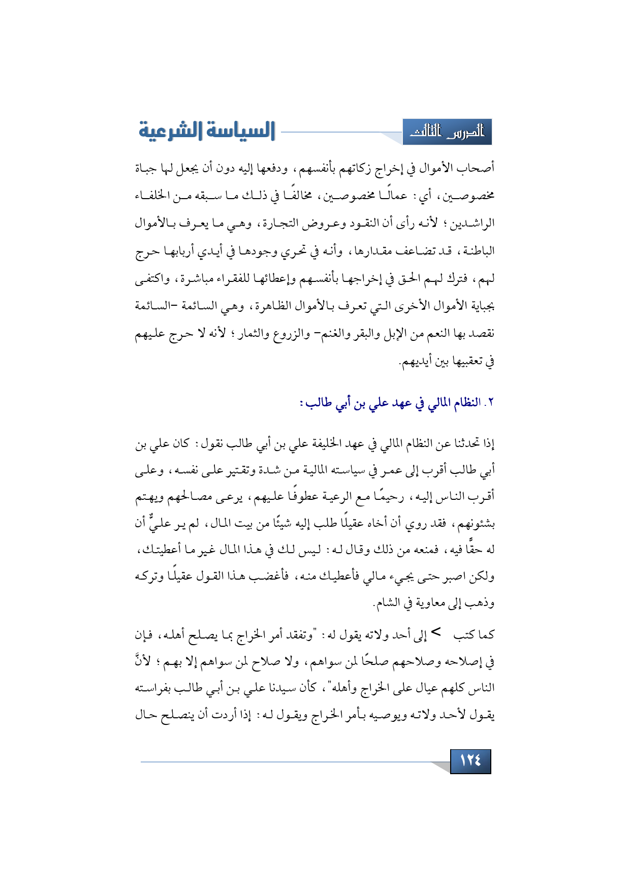 أصحاب الأموال في إخراج زكاتهم بأنفسهم, ودفعها إليه دون أن يجعل لها جباة مخصوصين, أي: عمالًا مخصوصين، مخالفًا في ذلك ما سبقه من الخلفاء الراشدين؛ لأنه رأى أن النقود وعروض التجارة, وهي ما يعرف بالأموال الباطنة, قد تضاعف مقدارها, وأنه في تحري وجودها في أيدي أربابها حرج لهم فترك لهم الحق في إخراجها بأنفسهم وإعطائها للفقراء مباشرة, واكتفى بجباية الأموال الأخرى التي تعرف بالأموال الظاهرة, وهي السائمة, -السائمة نقصد بها النعم من الإبل والبقر والغنم- والزروع والثمار؛ لأنه لا حرج عليهم في تعقبيها بين أيديهم.