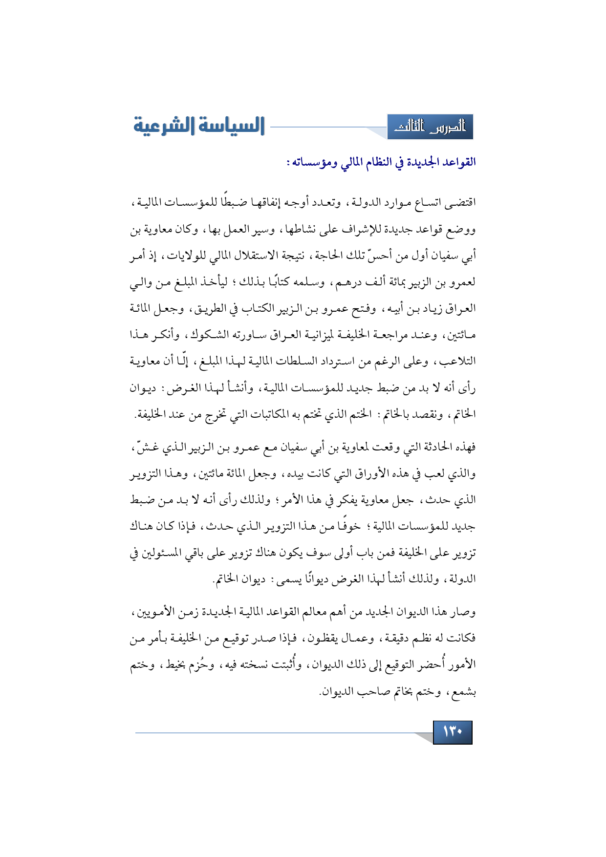 فهذه الحادثة التي وقعت لمعاوية بن أبي سفيان مع عمرو بن الزبير الذي غش، والذي لعب في هذه الأوراق التي كانت بيده، وجعل المائة مائتين، وهذا التزوير الذي حدث جعل معاوية يفكر في هذا الأمر؛ ولذلك رأى أنه لا بد من ضبط جديد للمؤسسات المالية؛ خوفًا من هذا التزوير الذي حدث، فإذا كان هناك تزوير على الخليفة فمن باب أولى سوف يكون هناك تزوير على باقي المسئولين في الدولة، ولذلك أنشأ لهذا الغرض ديوانًا يسمى: ديوان الخاتم.