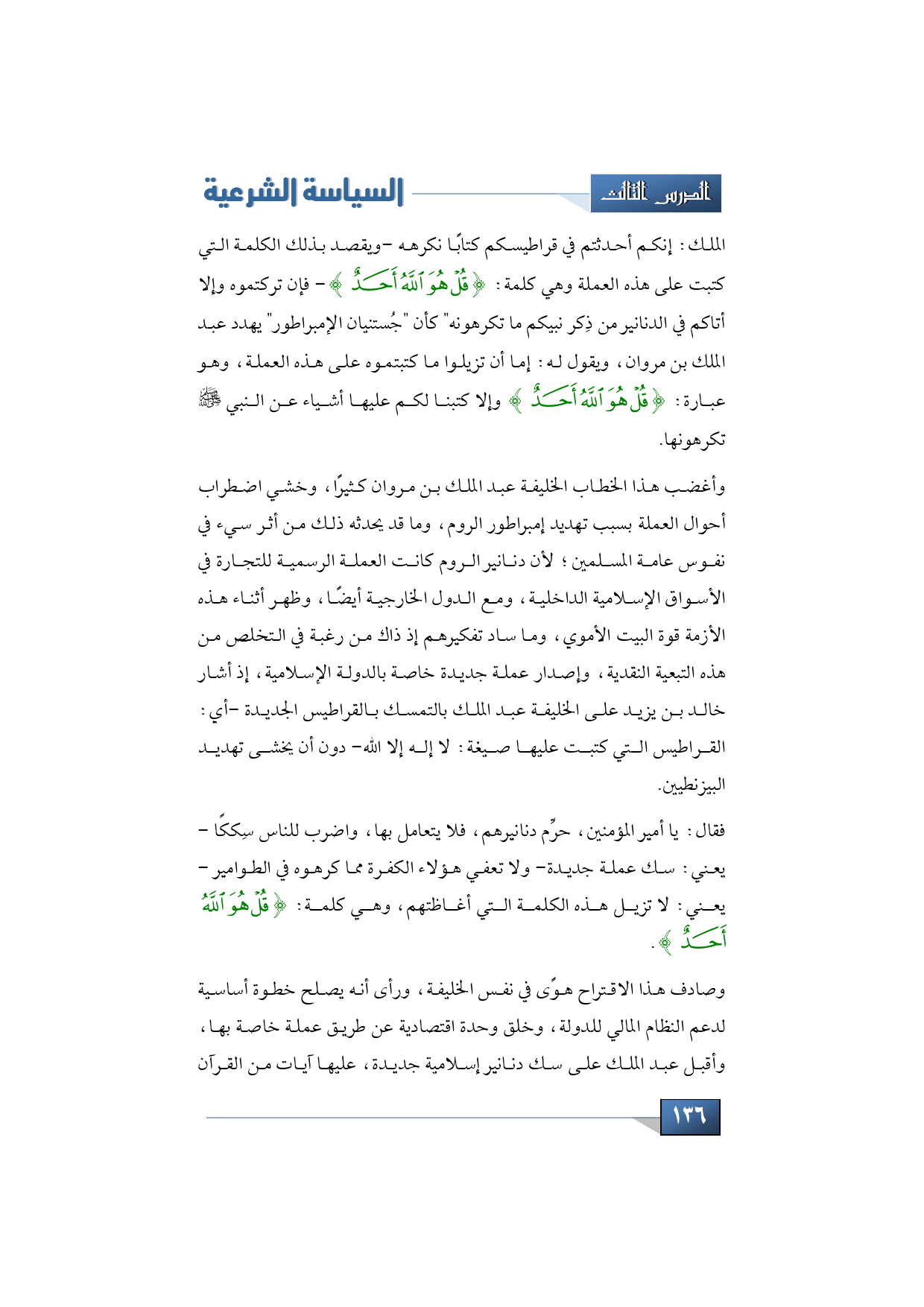 فقال: يا أمير المؤمنين، حرِّم دنانيرهم، فلا يتعامل بها، واضرب للناس سِككًا -يعني: سك عملة جديدة- ولا تعفي هؤلاء الكفرة مما كرهوه في الطوامير يعني: لا تزيل هذه الكلمة التي أغاظتهم، وهي كلمة: {قُلْ هُوَ اللهُ أَحَدٌ}.