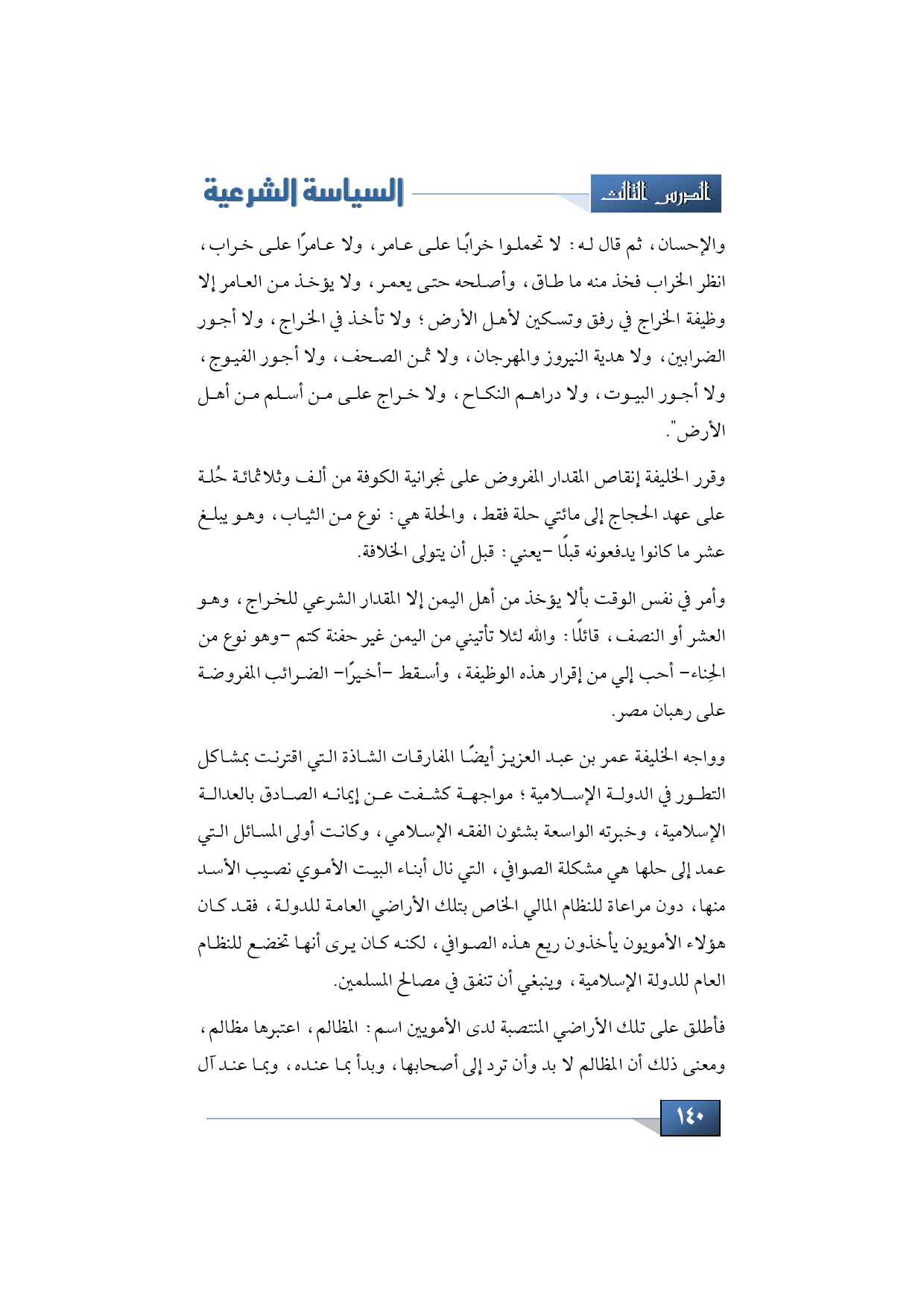 وأمر في نفس الوقت بألا يؤخذ من أهل اليمن إلا المقدار الشرعي للخراج، وهو العشر أو النصف، قائلًا: والله لئلا تأتيني من اليمن غير حفنة كتم -وهو نوع من الحِناء- أحب إلي من إقرار هذه الوظيفة، وأسقط -أخيرًا- الضرائب المفروضة على رهبان مصر.