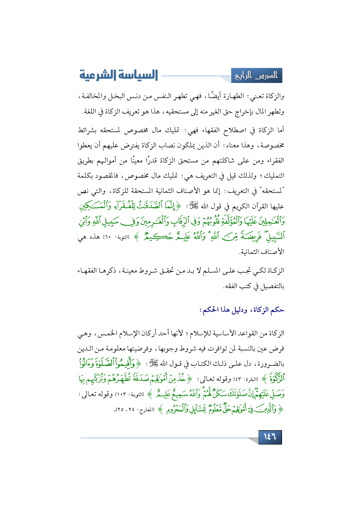 الزكاة من القواعد الأساسية للإسلام؛ لأنها أحد أركان الإسلام الخمس، وهي فرض عين بالنسبة لمن توافرت فيه شروط وجوبها، وفرضيتها معلومة من الدين بالضرورة، دل على ذلك الكتاب في قول الله- تبارك وتعالى-: {وَأَقِيمُوا الصَّلاةَ وَآتُوا الزَّكَاة} (البقرة: من الآية: 43) وقوله تعالى {خُذْ مِنْ أَمْوَالِهِمْ صَدَقَةً تُطَهِّرُهُمْ وَتُزَكِّيهِمْ بِهَا} (التوبة: من الآية 103) وقوله تعالى: {وَالَّذِينَ فِي أَمْوَالِهِمْ حَقٌّ مَعْلُومٌ لِلسَّائِلِ وَالْمَحْرُومِ} (المعارج: 24، 25).