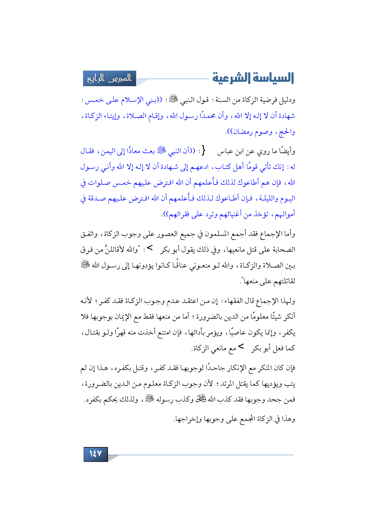 ولهذا الإجماع قال الفقهاء: إن من اعتقد عدم وجوب الزكاة فقد كفر؛ لأنه أنكر شيئًا معلومًا من الدين بالضرورة؛ أما من منعها فقط مع الإيمان بوجوبها فلا يكفر، وإنما يكون عاصيًا، ويؤمر بأدائها، فإن امتنع أخذت منه قهرًا ولو بقتال، كما فعل أبو بكر -رضي الله عنه- مع مانعي الزكاة.