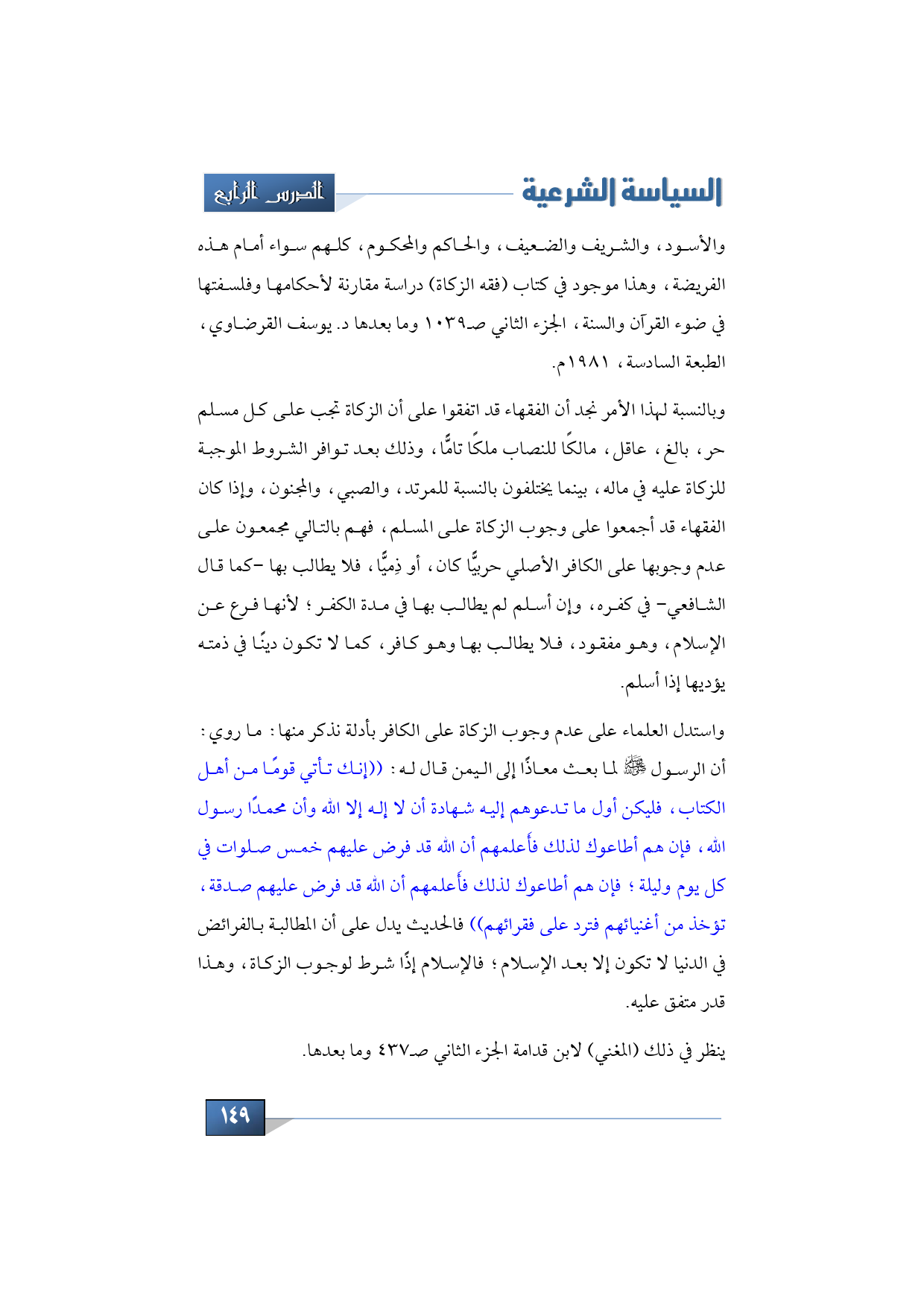 والأسود، والشريف والضعيف، والحاكم والمحكوم، كلهم سواء أمام هذه الفريضة، وهذا موجود في كتاب (فقه الزكاة) دراسة مقارنة لأحكامها وفلسفتها في ضوء القرآن والسنة، الجزء الثاني صـ1039 وما بعدها د. يوسف القرضاوي، الطبعة السادسة، 1981.