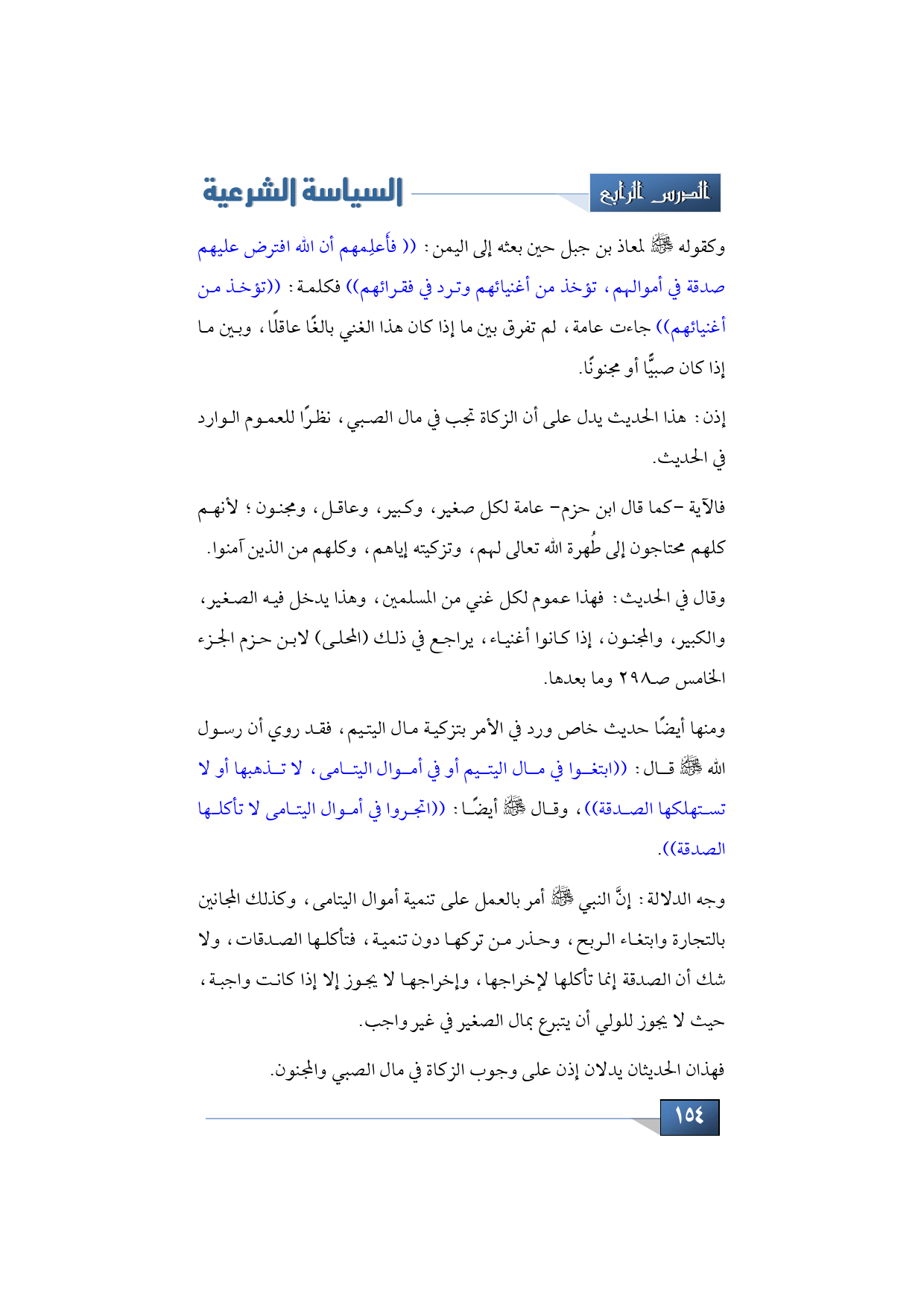 وجه الدلالة: أن النبي -صلى الله عليه وسلم- أمر بالعمل على تنمية أموال اليتامى، وكذلك المجانين بالتجارة وابتغاء الربح، وحذر من تركها دون تنمية، فتأكلها الصدقات، ولا شك أن الصدقة إنما تأكلها لإخراجها، وإخراجها لا يجوز إلا إذا كانت واجبة، حيث لا يجوز للولي أن يتبرع بمال الصغير في غير واجب.