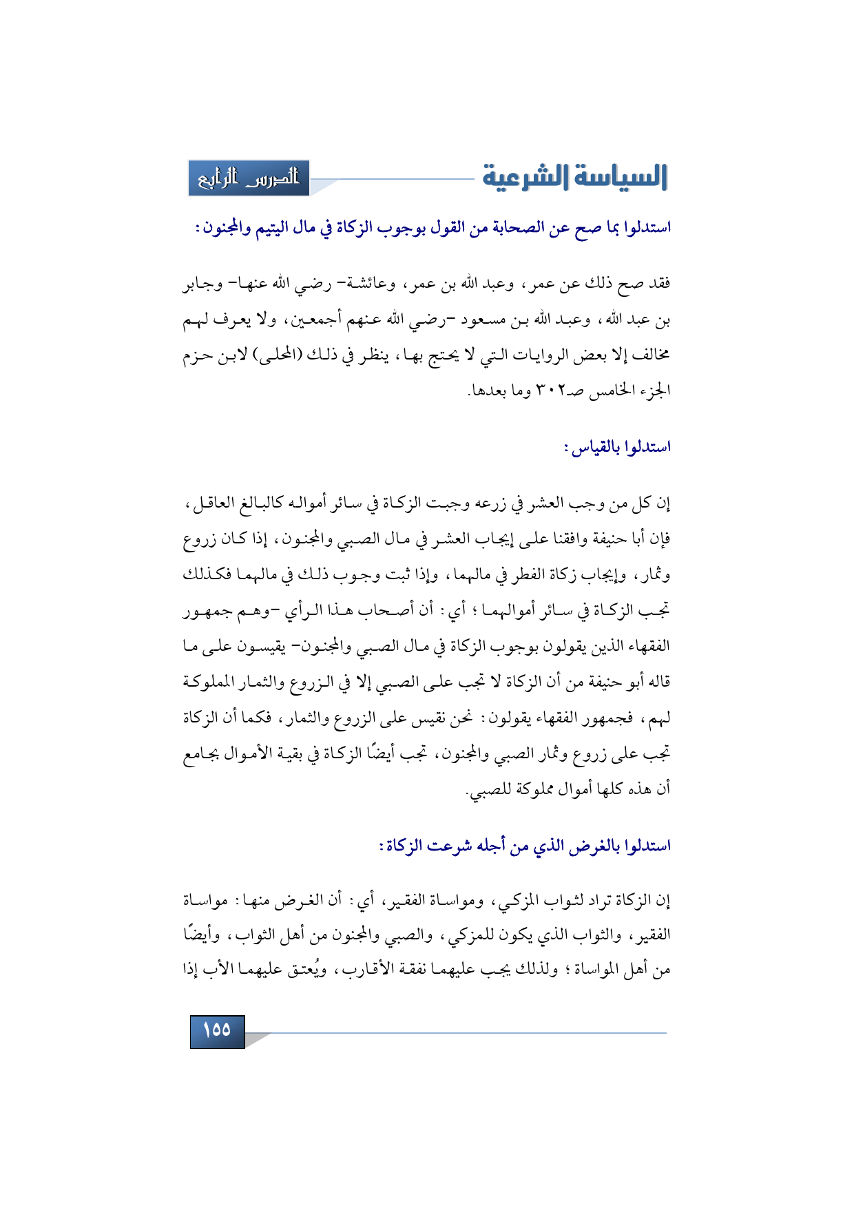 واستدلوا أيضًا بالقياس فقالوا: إن كل من وجب العشر في زرعه وجبت الزكاة في سائر أمواله كالبالغ العاقل، فإن أبا حنيفة وافقنا على إيجاب العشر في مال الصبي والمجنون، إذا كان زروع وثمار، وإيجاب زكاة الفطر في مالهما، وإذا ثبت وجوب ذلك في مالهما فكذلك تجب الزكاة في سائر أموالهما؛ أي: أن أصحاب هذا الرأي -وهم جمهور الفقهاء الذين يقولون بوجوب الزكاة في مال الصبي والمجنون- يقيسون على ما قاله أبو حنيفة من أن: الزكاة لا تجب على الصبي إلا في الزروع والثمار المملوكة لهم، فهم يقولون أو جمهور الفقهاء يقولون: نحن نقيس على الزروع والثمار، فكما أن الزكاة تجب على زروع وثمار الصبي والمجنون، تجب أيضًا الزكاة في بقية الأموال بجامع أن هذه كلها أموال مملوكة للصبي.