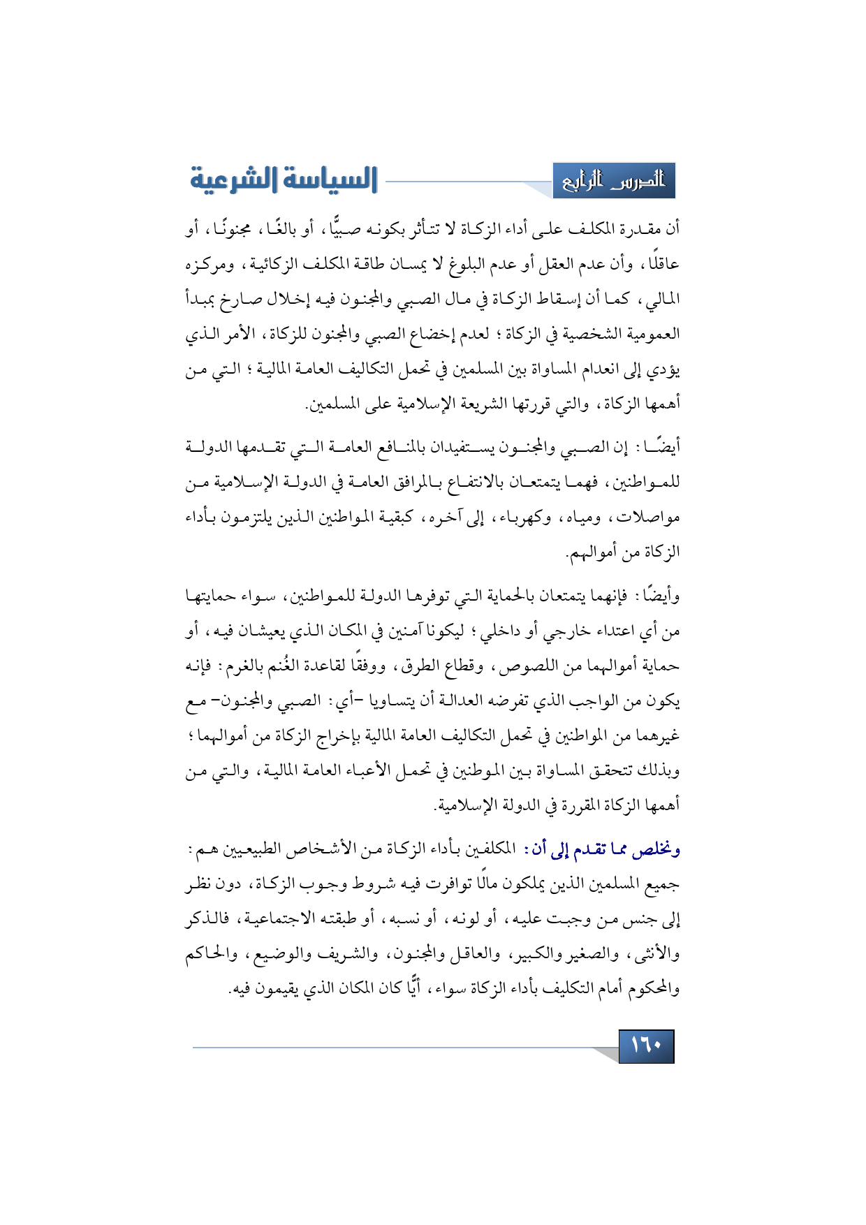 ونخلص مما تقدم إلى أن: المكلفين بأداء الزكاة من الأشخاص الطبيعيين هم: جميع المسلمين الذين يملكون مالًا توافرت فيه شروط وجوب الزكاة، دون نظر إلى جنس من وجبت عليه، أو لونه، أو نسبه، أو طبقته الاجتماعية، فالذكر والأنثى، والصغير والكبير، والعاقل والمجنون، والشريف والوضيع، والحاكم والمحكوم أمام التكليف بأداء الزكاة سواء، أيًّا كان المكان الذي يقيمون فيه.
