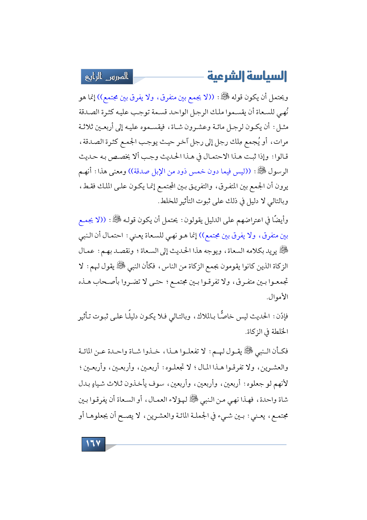 وأيضًا في اعتراضهم على الدليل يقولون: يحتمل أن يكون قوله -صلى الله عليه وسلم-: ((لا يجمع بين متفرق، ولا يفرق بين مجتمع)) إنما هو نهي للسعاة يعني: احتمال أن النبي -صلى الله عليهم وسلم- يريد بكلامه السعاة، ويوجه هذا الحديث إلى السعاة؛ ونقصد بهم: عمال الزكاة الذين كانوا يقومون بجمع الزكاة من الناس، فكأن النبي -صلى الله عليه وسلم- يقول لهم: لا تجمعوا بين متفرق، ولا تفرقوا بين مجتمع؛ حتى لا تضروا بأصحاب هذه الأموال.
