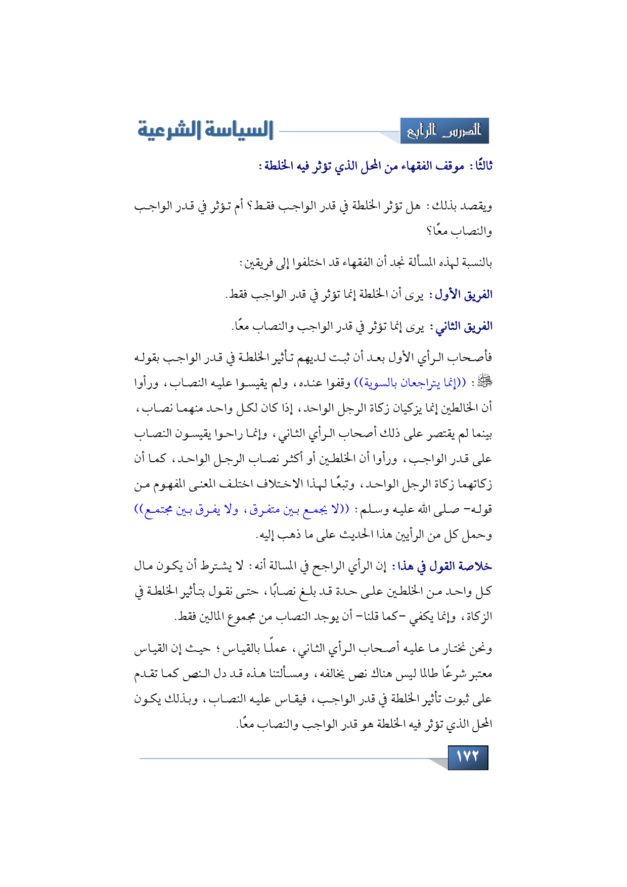 الفريق الأول: يرى أن الخلطة إنما تؤثر في قدر الواجب فقط.