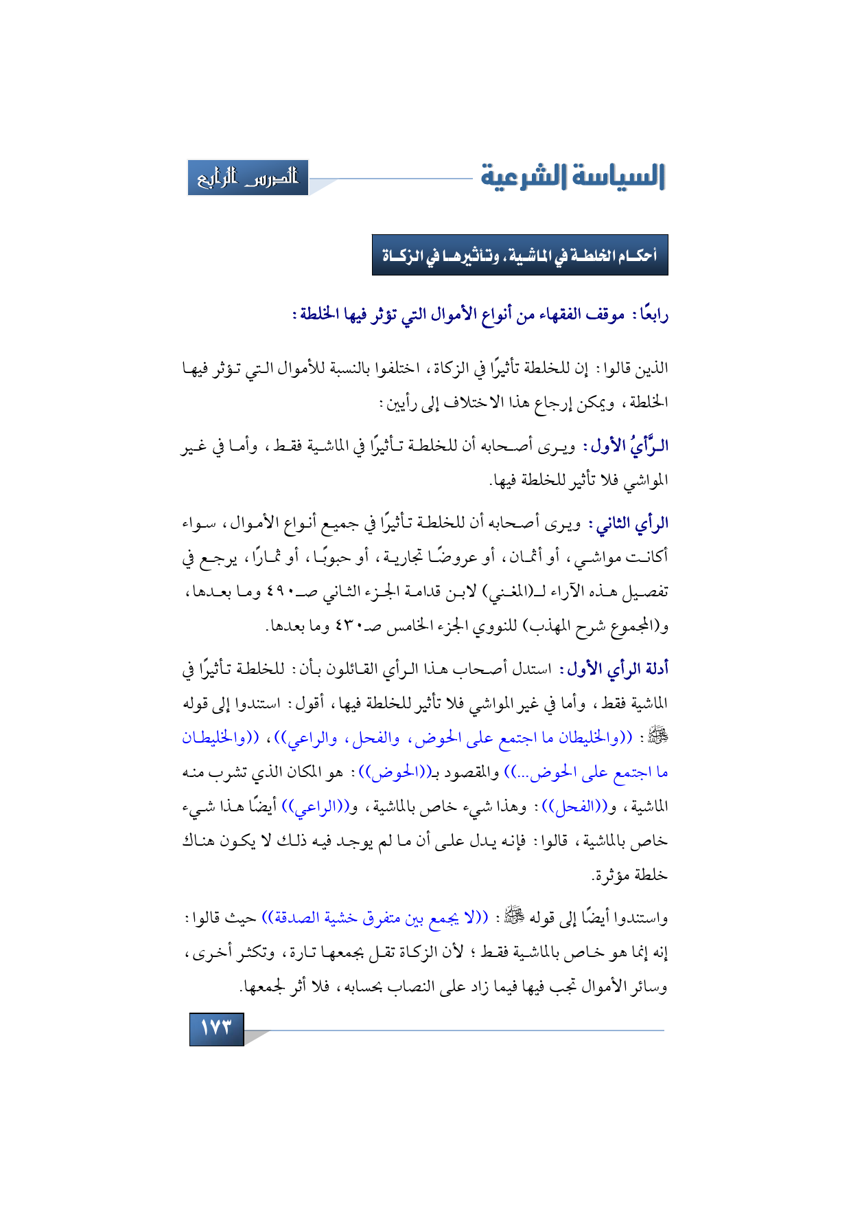 أدلة الرأي الأول: استدل أصحاب هذا الرأي القائلون بأن: للخلطة تأثيرًا في الماشية فقط، وأما في غير المواشي فلا تأثير للخلطة فيها، أقول: استندوا إلى قوله -صلى الله عليه وسلم-: ((والخليطان ما اجتمع على الحوض، والفحل، والراعي)) ((والخليطان ما اجتمع على الحوض ... )) والمقصود بـ ((الحوض)): هو المكان الذي تشرب منه الماشية، و ((الفحل)): وهذا شيء خاص بالماشية، و ((الراعي)) أيضًا هذا شيء خاص بالماشية، قالوا: فإنه يدل على أن ما لم يوجد فيه ذلك -يعني: ما لم يوجد فيه الحوض والفحل والراعي- لا يكون هناك خلطة مؤثرة.