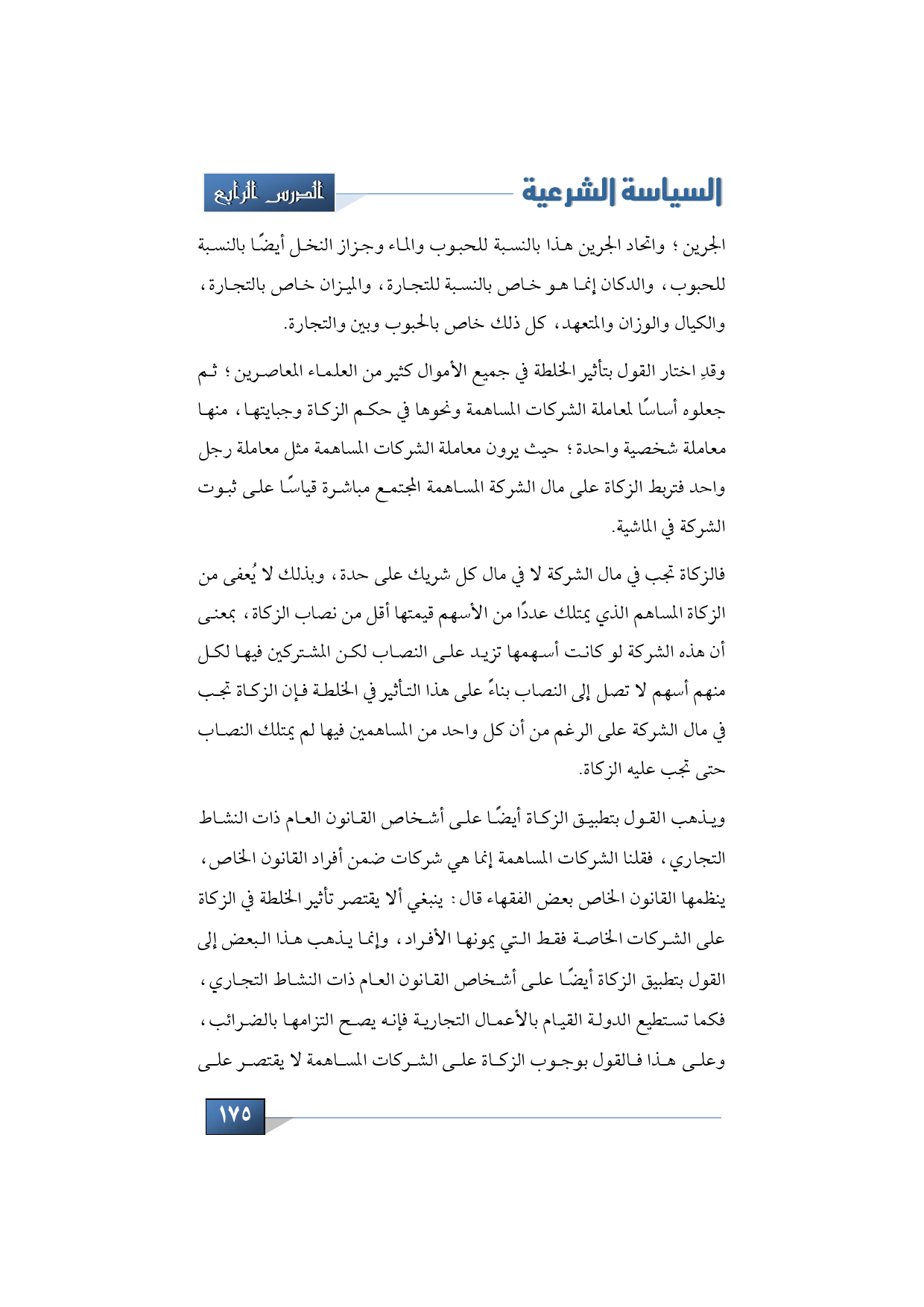 أقول ذكرنا آراء الفقهاء في هذه المسائل والأدلة التي استندوا إليها في تأييد أقوالهم، ورجحنا القول بأن للخلطة تأثير في الزكاة وتأثيرها يشمل خلطة الشركة وخلطة الجوار معًا، وأن الخلطة تؤثر في النصاب وقدر الواجب معًا، وأيضًا فإن للخلطة تأثير في جميع الأموال وليس الماشية فقط أي أنها لها تأثير في الزروع والثمار والدراهم والدنانير، وعلى هذا ذهب بعض الفقهاء المعاصرين إلى تطبيق نظام الخلطة على الشركات المساهمة، حيث يرون معاملة الشركات المساهمة مثل معاملة رجل واحد فتربط الزكاة على مال الشركة المساهمة المجتمع مباشرة قياسًا على ثبوت الشركة في الماشية.