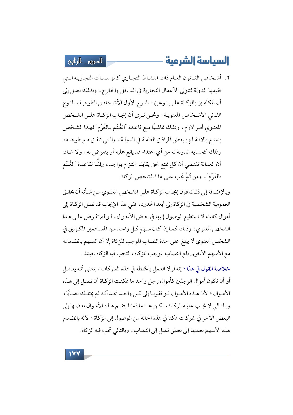2 - أشخاص القانون العام ذات النشاط التجاري كالمؤسسات التجارية التي تقيمها الدولة لتتولى الأعمال التجارية في الداخل والخارج، وبذلك نصل إلى أن المكلفين بالزكاة على نوعين: النوع الأول الأشخاص الطبيعية، النوع الثاني الأشخاص المعنوية، ونحن نرى أن إيجاب الزكاة على الشخص المعنوي أمر لازم، وذلك تماشيًا مع قاعدة "الغُنْم بالغُرْم" فهذا الشخص يتمتع بالانتفاع ببعض المرافق العامة في الدولة، والتي تتفق مع طبيعته وذلك كحماية الدولة له من أي اعتداء قد يقع عليه أو يتعرض له، ولا شك أن العدالة تقتضي أن كل تمتع بحق يقابله التزام بواجب وفقًا لقاعدة "الغُنْم بالغُرْم"، ومن ثم تجب على هذا الشخص الزكاة.