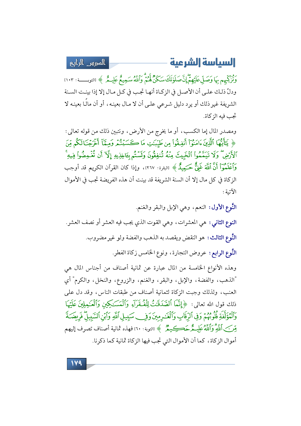 والنوع الرابع: عروض التجارة، ونوع الخامس زكاة الفطر.