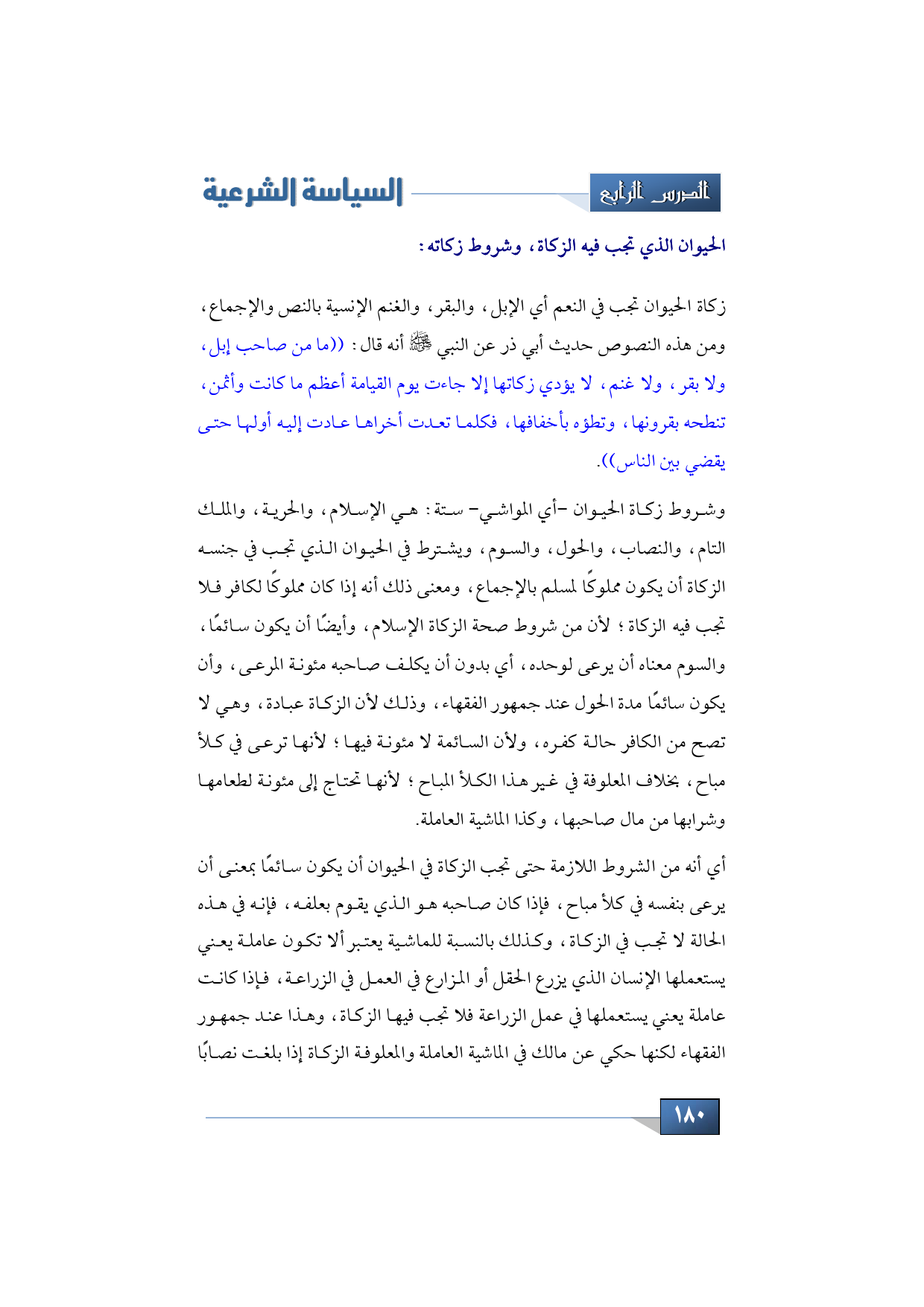 أي أنه من الشروط اللازمة حتى تجب الزكاة في الحيوان أن يكون سائمًا بمعنى أن يرعى بنفسه في كلأ مباح، فإذا كان صاحبه هو الذي يقوم بعلفه، فإنه في هذه الحالة لا تجب في الزكاة، وكذلك بالنسبة للماشية يعتبر ألا تكون عاملة يعني يستعملها الإنسان الذي يزرع الحقل أو المزارع في العمل في الزراعة، فإذا كانت عاملة يعني يستعملها في عمل الزراعة فلا تجب فيها الزكاة، وهذا عند جمهور الفقهاء لكنها حكي عن مالك في الماشية العاملة والمعلوفة الزكاة إذا بلغت نصابًا
