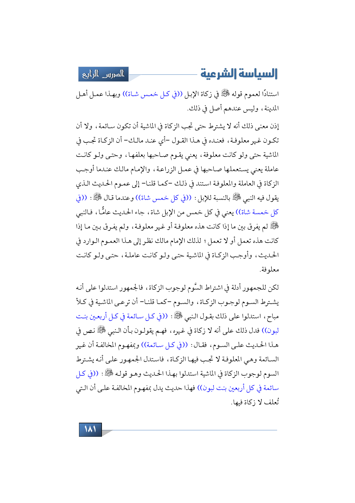 إذن معنى ذلك أنه لا يشترط حتى تجب الزكاة في الماشية أن تكون سائمة، ولا أن تكون غير معلوفة، فعنده في هذا القول -أي عند مالك- أن الزكاة تجب في الماشية حتى ولو كانت معلوفة، يعني يقوم صاحبها بعلفها، وحتى ولو كانت عاملة يعني يستعملها صاحبها في عمل الزراعة، والإمام مالك عندما أوجب الزكاة في العاملة والمعلوفة استند في ذلك -كما قلنا- إلى عموم الحديث الذي يقول فيه النبي -صلى الله عليه وسلم- بالنسبة للإبل: ((في كل خمس شاة)) وعندما قال -صلى الله عليه وسلم-: ((في كل خمسة شاة)) يعني في كل خمس من الإبل شاة، جاء الحديث عامًّا، فالنبي -صلى الله عليه وسلم- لم يفرق بين ما إذا كانت هذه معلوفة أو غير معلوفة، ولم يفرق بين ما إذا كانت هذه تعمل أو لا تعمل؛ لذلك الإمام مالك نظر إلى هذا العموم الوارد في الحديث، وأوجب الزكاة في الماشية حتى ولو كانت عاملة، حتى ولو كانت معلوفة.