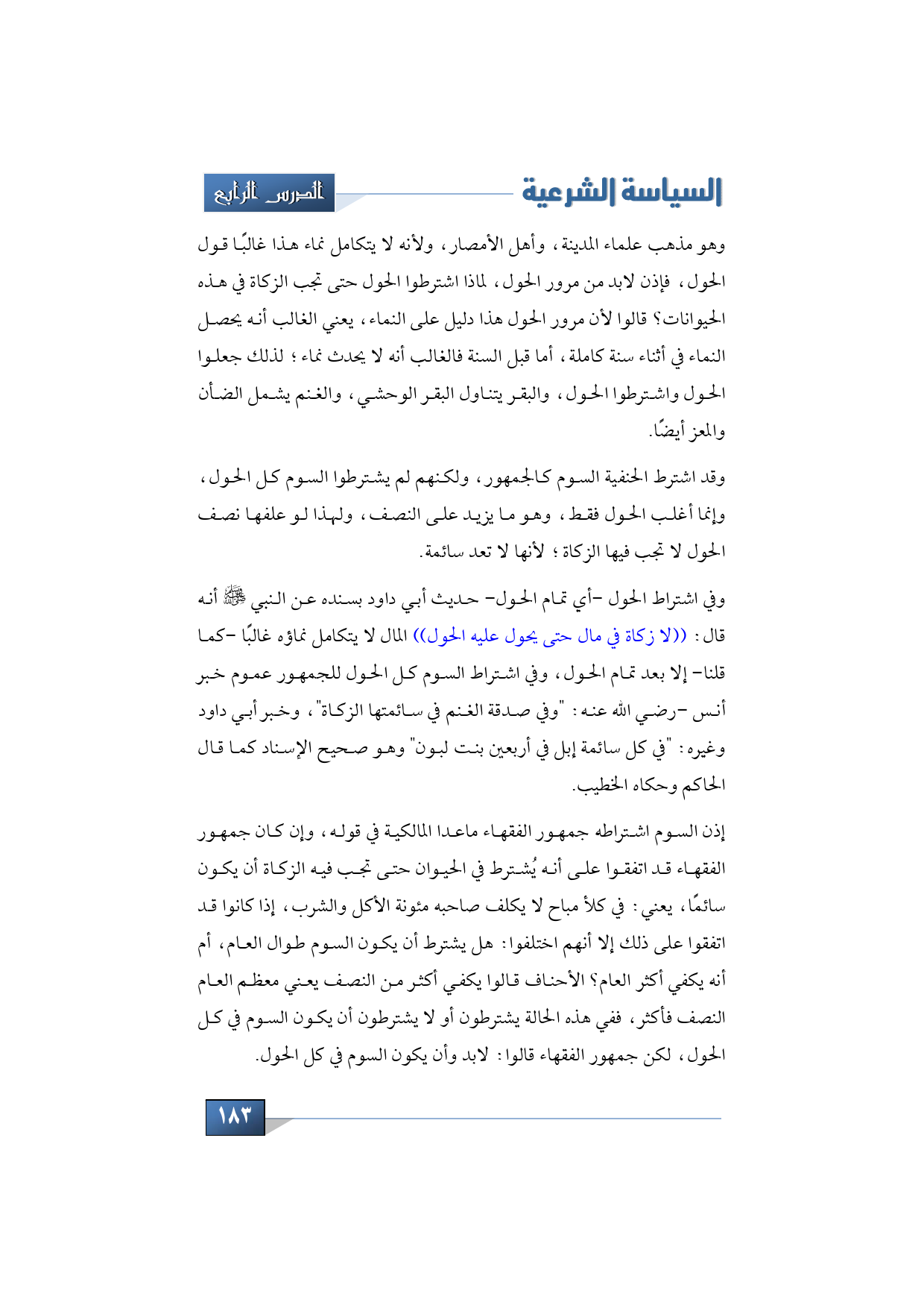 وهو مذهب علماء المدينة، وأهل الأمصار، ولأنه لا يتكامل نماء هذا غالبًا قول الحول، فإذن لابد من مرور الحول، لماذا اشترطوا الحول حتى تجب الزكاة في هذه الحيوانات؟ قالوا لأن مرور الحول هذا دليل على النماء، يعني الغالب أنه يحصل النماء في أثناء سنة كاملة، أما قبل السنة فالغالب أنه لا يحدث نماء؛ لذلك جعلوا الحول واشترطوا الحول، والبقر يتناول البقر الوحشي، والغنم يشمل الضأن والمعز أيضًا.