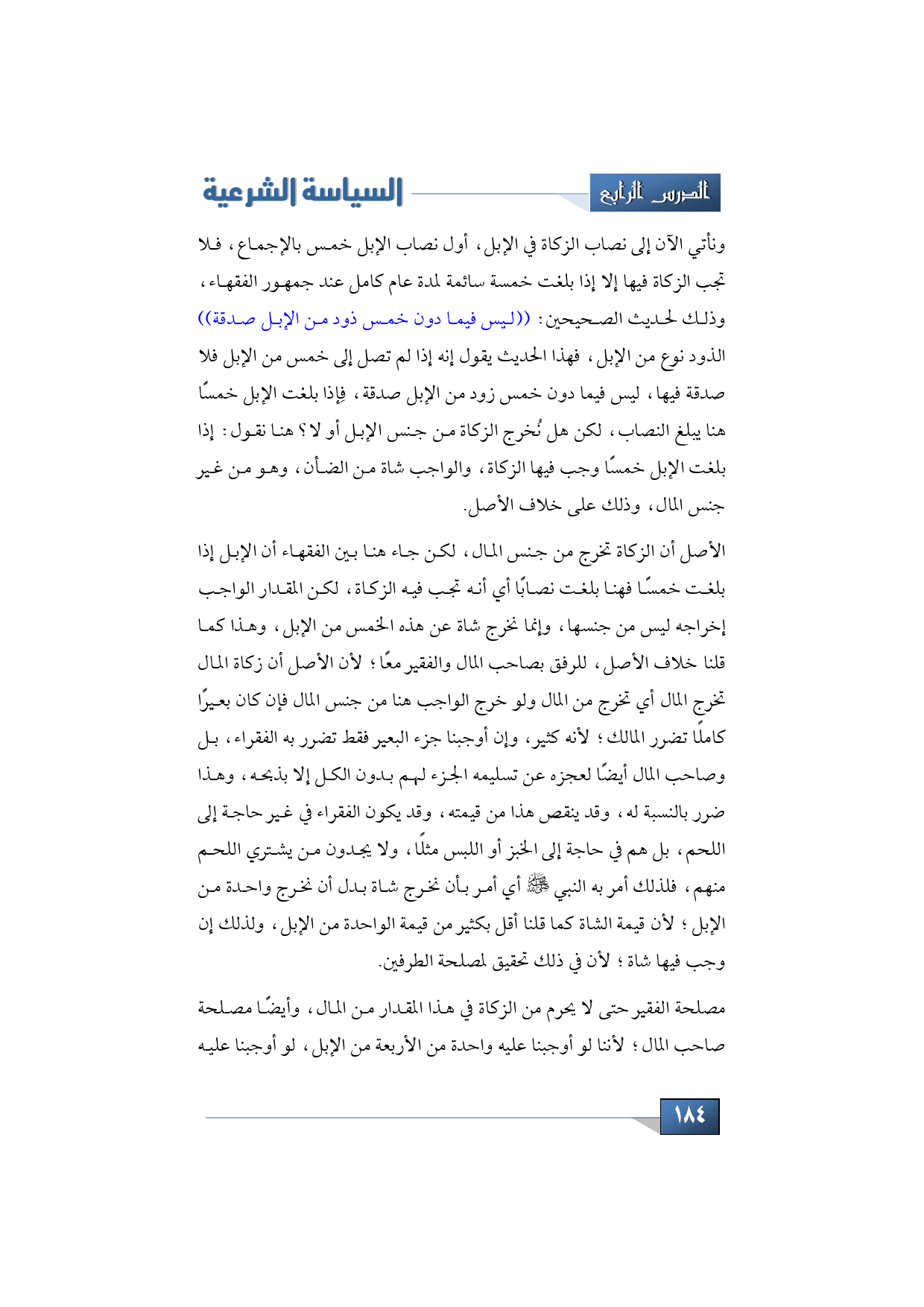 الأصل أن الزكاة تخرج من جنس المال، لكن جاء هنا بين الفقهاء أن الإبل إذا بلغت خمسًا فهنا بلغت نصابًا أي أنه تجب فيه الزكاة، لكن المقدار الواجب إخراجه ليس من جنسها، وإنما نخرج شاة عن هذه الخمس من الإبل، وهذا كما قلنا خلاف الأصل، لماذا إنما كان على خلاف الأصل للرفق بصاحب المال والفقير معًا؛ لأن الأصل أن زكاة المال تخرج المال أي تخرج من المال ولو خرج الواجب هنا من جنس المال فإن كان بعيرًا كاملًا تضرر المالك؛ لأنه كثير، وإن أوجبنا جزء البعير فقط تضرر به الفقراء، بل وصاحب المال أيضًا لعجزه عن تسليمه الجزء لهم بدون الكل إلا بذبحه، وهذا ضرر بالنسبة له، وقد ينقص هذا من قيمته، وقد يكون الفقراء في غير حاجة إلى اللحم، بل هم في حاجة إلى الخبز أو اللبس مثلًا، ولا يجدون من يشتري اللحم منهم، فلذلك أمر به النبي -صلى الله عليه وسلم- أي أمر بأن نخرج شاة بدل أن نخرج واحدة من الإبل؛ لأن قيمة الشاة كما قلنا أقل بكثير من قيمة الواحدة من الإبل، ولذلك -كما قلنا- إن وجب فيها شاة؛ لأن في ذلك تحقيق لمصلحة الطرفين.