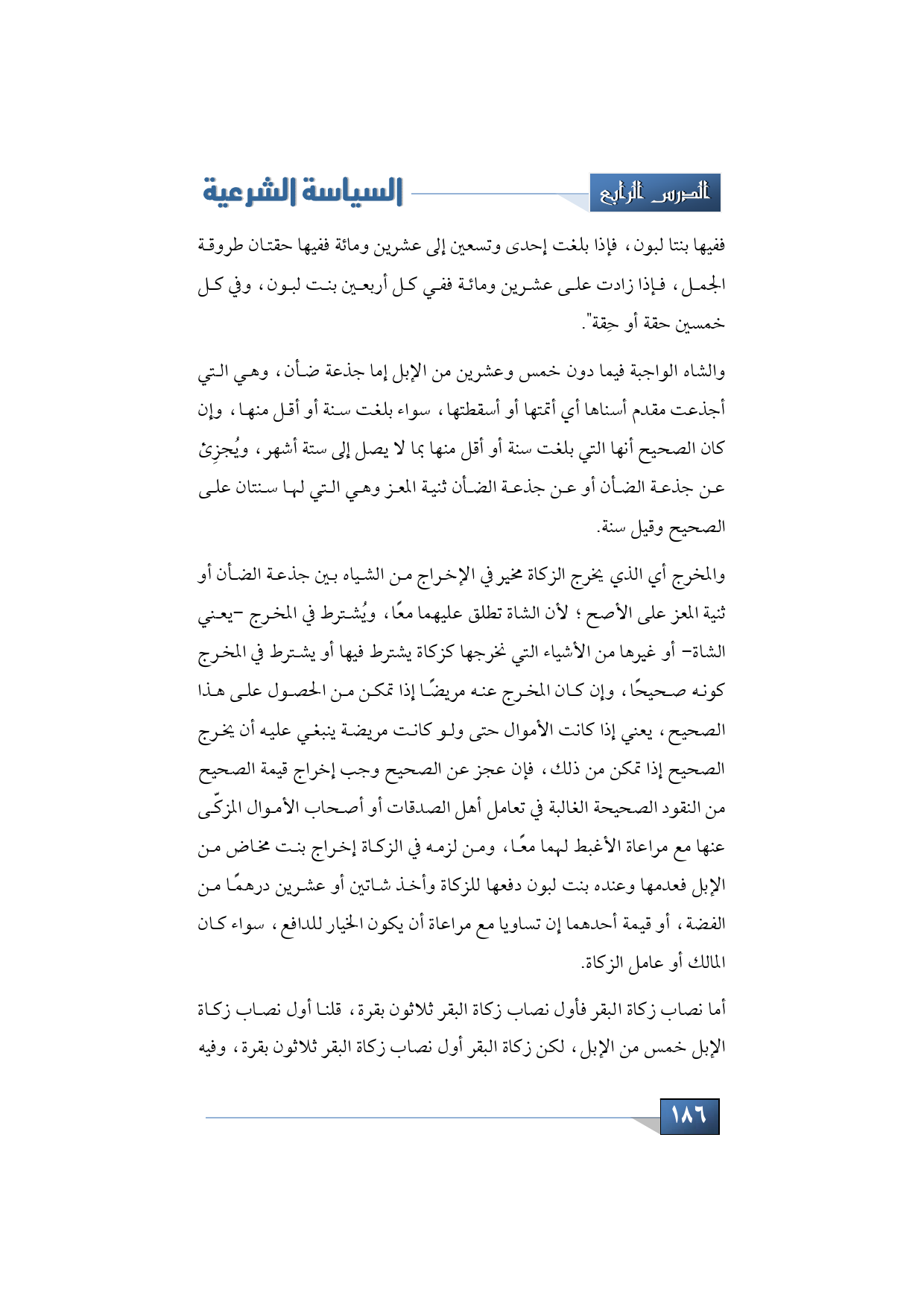 والمخرج أي الذي يخرج الزكاة مخير في الإخراج من الشياه بين جذعة الضأن أو ثنية المعز على الأصح؛ لأن الشاة تطلق عليهما معًا، ويُشترط في المخرج -يعني الشاة- أو غيرها من الأشياء التي نخرجها كزكاة يشترط فيها أو يشترط في المخرج كونه صحيحًا، وإن كان المخرج عنه مريضًا إذا تمكن من الحصول على هذا الصحيح، يعني إذا كانت الأموال حتى ولو كانت مريضة ينبغي عليه أن يخرج الصحيح إذا تمكن من ذلك، فإن عجز عن الصحيح وجب إخراج قيمة الصحيح من النقود الصحيحة الغالبة في تعامل أهل الصدقات أو أصحاب الأموال المزكّى عنها مع مراعاة الأغبط لهما معًا، ومن لزمه في الزكاة إخراج بنت مخاض من الإبل فعدمها وعنده بنت لبون دفعها للزكاة وأخذ شاتين أو عشرين درهمًا من الفضة، أو قيمة أحدهما إن تساويًا مع مراعاة أن يكون الخيار للدافع، سواء كان المالك أو عامل الزكاة.
