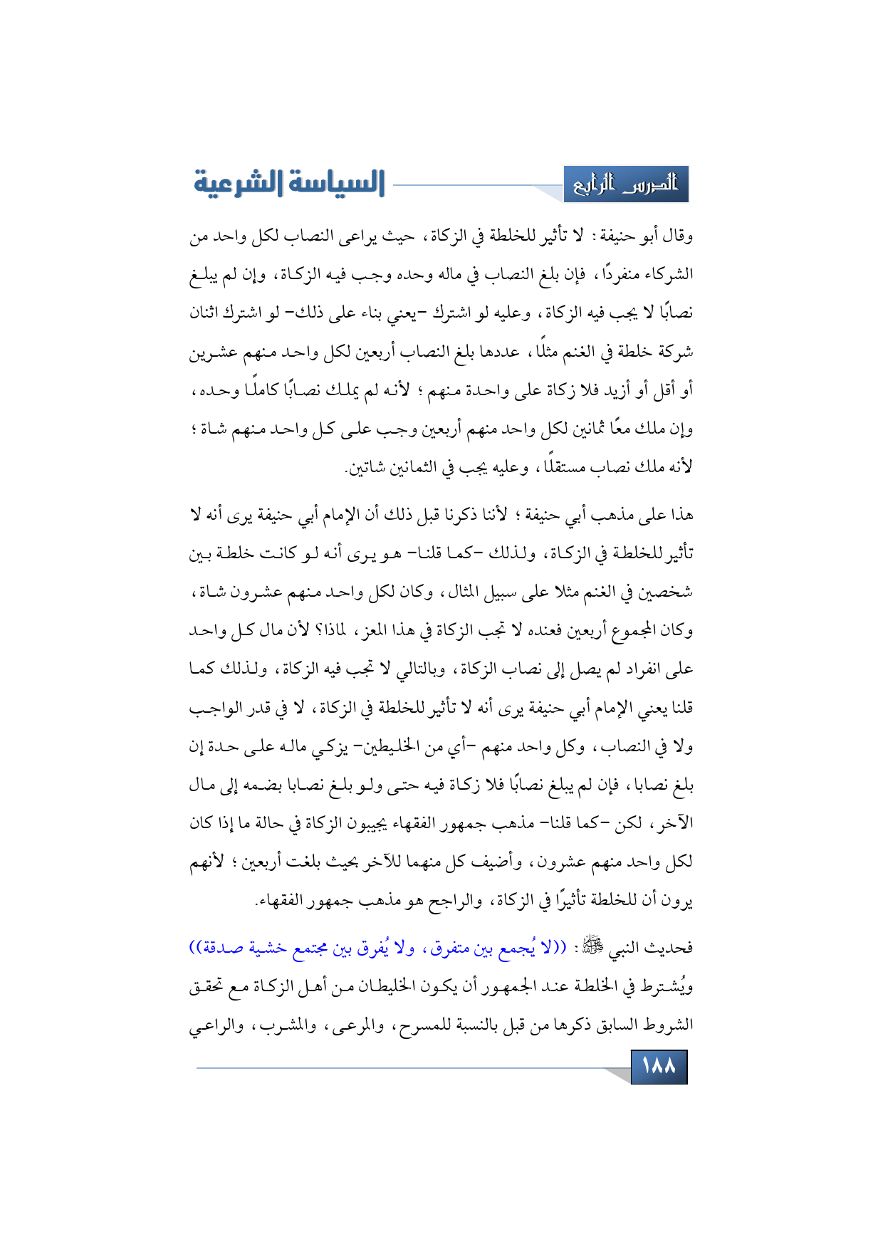 فحديث النبي -صلى الله عليه وسلم-: ((لا يُجمع بين متفرق، ولا يُفرق بين مجتمع خشية صدقة)) ويُشترط في الخلطة عند الجمهور أن يكون الخليطان من أهل الزكاة مع تحقق الشروط السابق ذكرها من قبل بالنسبة للمسرح، والمرعى، والمشرب، والراعي