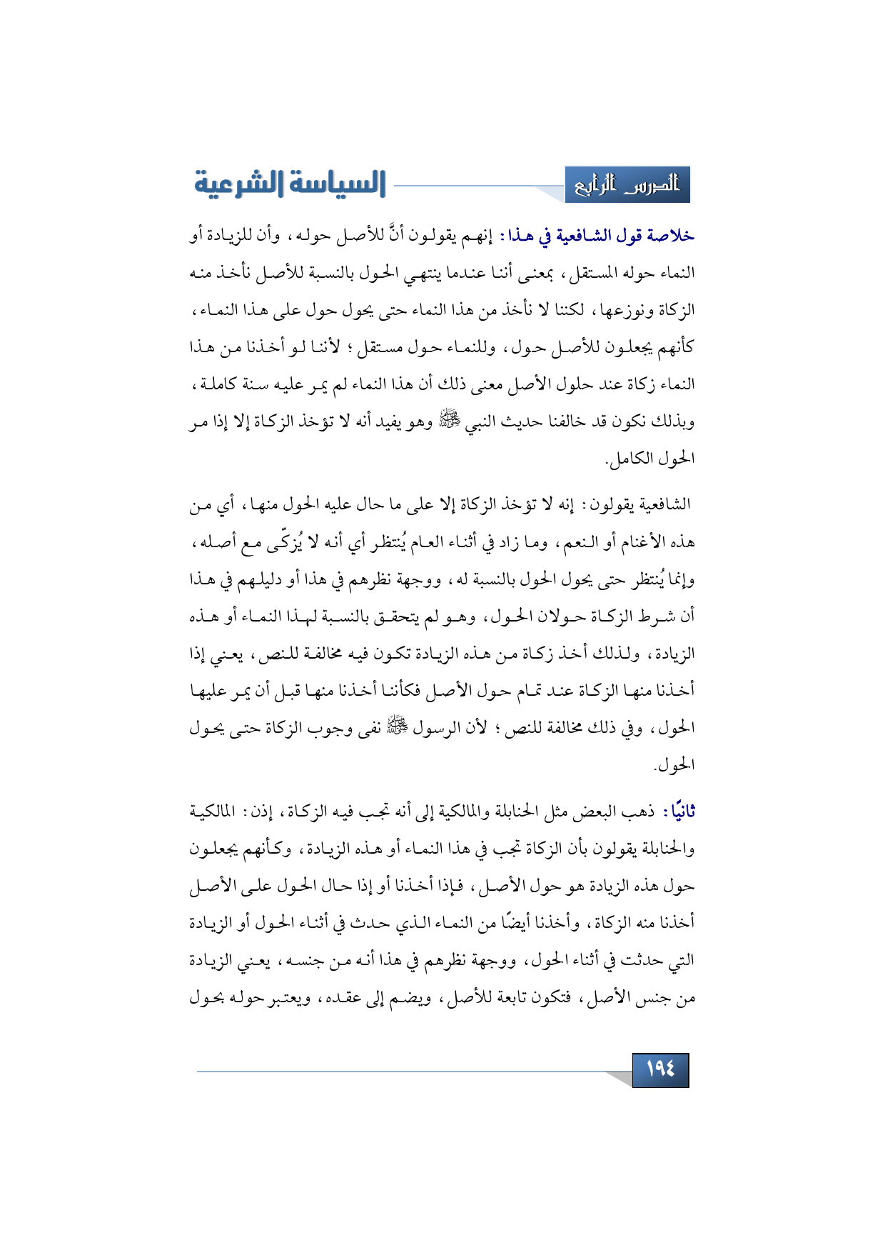 أقول: الشافعية يقولون أنه لا تؤخذ الزكاة إلا على ما حال عليه الحول منها، أي من هذه الأغنام أو النعم، وما زاد في أثناء العام يُنتظر أي أنه لا يُزكّى مع أصله، وإنما يُنتظر حتى يحول الحول بالنسبة له، ووجهة نظرهم في هذا أو دليلهم في هذا أن شرط الزكاة حولان الحول، وهو لم يتحقق بالنسبة لهذا النماء أو هذه الزيادة، ولذلك أخذ زكاة من هذه الزيادة تكون فيه مخالفة للنص، يعني إذا أخذنا منها الزكاة عند تمام حول الأصل فكأننا أخذنا منها قبل أن يمر عليها الحول، وفي ذلك مخالفة للنص؛ لأن الرسول -صلى الله عليه وسلم- نفى وجوب الزكاة حتى يحول الحول.
