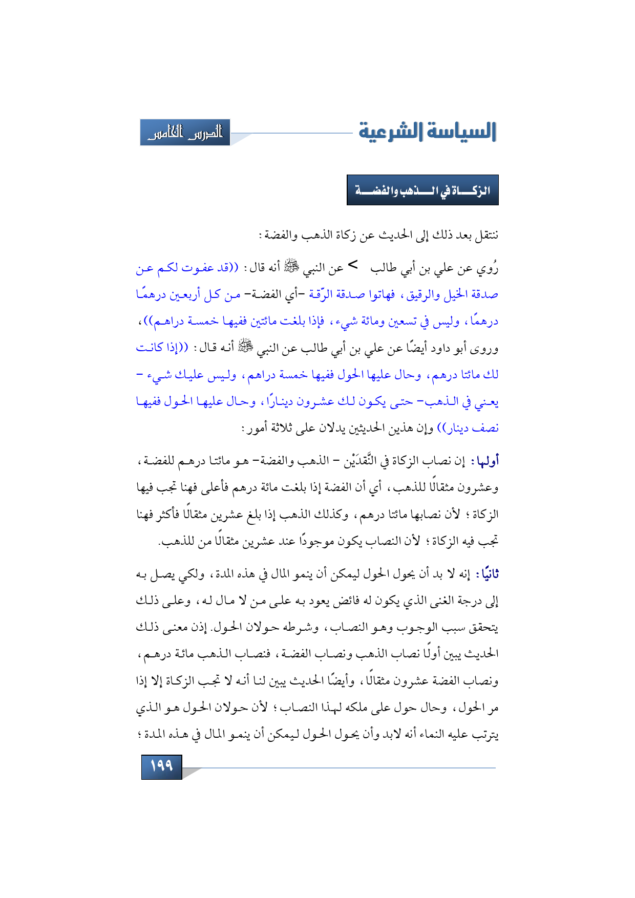 ننتقل بعد ذلك إلى زكاة أو الحديث عن زكاة الذهب والفضة، رُوي عن علي بن أبي طالب -كرم الله وجهه- عن النبي -صلى الله عليه وسلم- أنه قال: ((قد عفوت لكم عن صدقة الخيل والرقيق، فهاتوا صدقة الرّقة -أي الفضة- من كل أربعين درهمًا درهمًا، وليس في تسعين ومائة شيء، فإذا بلغت مائتين ففيها خمسة دراهم)) وروى أبو داود أيضًا عن علي بن أبي طالب عن النبي -صلى الله عليه وسلم- أنه قال: ((إذا كانت لك مائتا درهم، وحال عليها الحول ففيها خمسة دراهم، وليس عليك شيء -يعني في الذهب- حتى يكون لك عشرون دينارًا، وحال عليها الحول ففيها نصف دينار)) وإن هذين الحديثين يدلان على ثلاثة أمور: