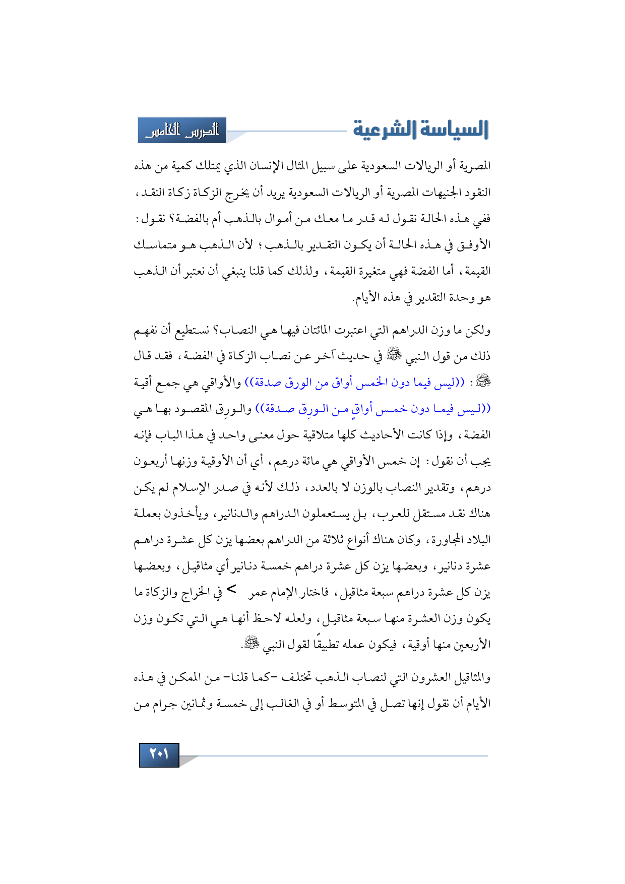 ولكن ما وزن الدراهم التي اعتبرت المائتان فيها هي النصاب؟ نستطيع أن نفهم ذلك من قول النبي -صلى الله عليه وسلم- في حديث آخر عن نصاب الزكاة في الفضة، فقد قال -صلى الله عليه وسلم-: ((ليس فيما دون الخمس أواق من الورق صدقة)) والأواقي هي جمع أقية ((ليس فيما دون خمس أواقٍ من الورِق صدقة)) والورِق المقصود بها هي الفضة، وإذا كانت الأحاديث كلها متلاقية حول معنى واحد في هذا الباب فإنه يجب أن نقول: إن خمس الأواقي هي مائة درهم، أي أن الأوقية وزنها أربعون درهم، وتقدير النصاب بالوزن لا بالعدد، ذلك لأنه في صدر الإسلام لم يكن هناك نقد مستقل للعرب، بل يستعملون الدراهم والدنانير، ويأخذون بعملة البلاد المجاورة، وكان هناك أنواع ثلاثة من الدراهم بعضها يزن كل عشرة دراهم عشرة دنانير، وبعضها يزن كل عشرة دراهم خمسة دنانير أي مثاقيل، وبعضها يزن كل عشرة دراهم سبعة مثاقيل، فاختار الإمام عمر -رضي الله عنه- في الخراج والزكاة ما يكون وزن العشرة منها سبعة مثاقيل، ولعله لاحظ أنها هي التي تكون وزن الأربعين منها أوقية، فيكون عمله تطبيقًا لقول النبي -صلى الله عليه وسلم.