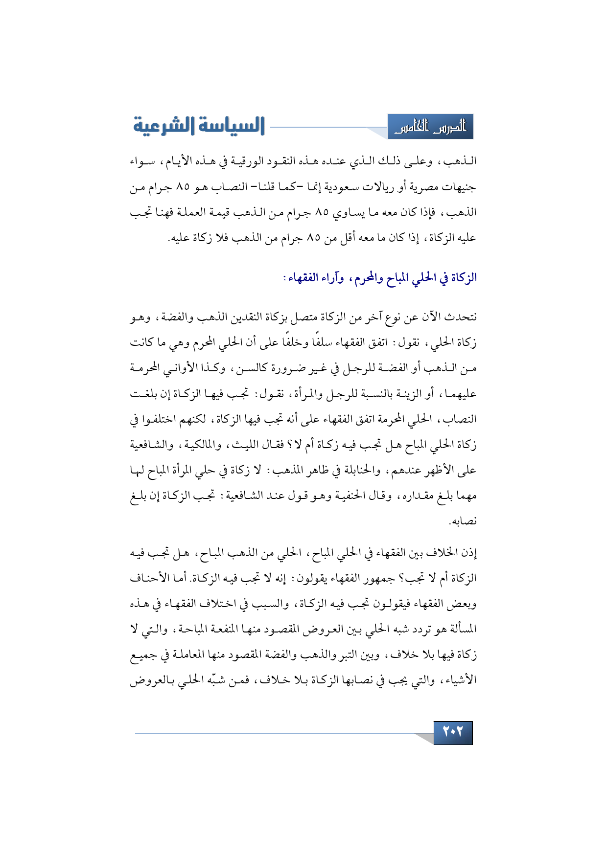 إذن الخلاف بين الفقهاء في الحلي المباح، الحلي من الذهب المباح، هل تجب فيه الزكاة أم لا تجب؟ جمهور الفقهاء يقولون بأنه لا تجب فيه الزكاة. أما الأحناف وبعض الفقهاء فيقولون تجب فيه الزكاة، والسبب في اختلاف الفقهاء في هذه المسألة هو تردد شبه الحلي بين العروض المقصود منها المنفعة المباحة، والتي لا زكاة فيها بلا خلاف، وبين التبر والذهب والفضة المقصود منها المعاملة في جميع الأشياء، والتي يجب في نصابها الزكاة بلا خلاف، فمن شبّه الحلي بالعروض