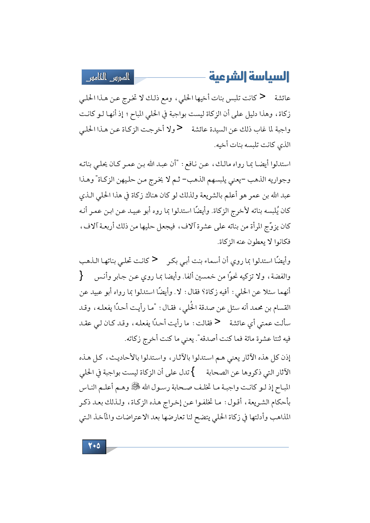 إذن كل هذه الآثار يعني هم استدلوا بالآثار، واستدلوا بالأحاديث، كل هذه الآثار التي ذكروها عن الصحابة -رضوان الله تبارك وتعالى عليهم- تدل على أن الزكاة ليست بواجبة في الحلي المباح إذ لو كانت واجبة ما تخلف صحابة رسول الله -صلى الله عليه وسلم- وهم أعلم الناس بأحكام الشريعة، أقول: ما تخلفوا عن إخراج هذه الزكاة، ولذلك بعد ذكر المذاهب وأدلتها في زكاة الحلي يتضح لنا تعارضها بعد الاعتراضات والمآخذ التي
