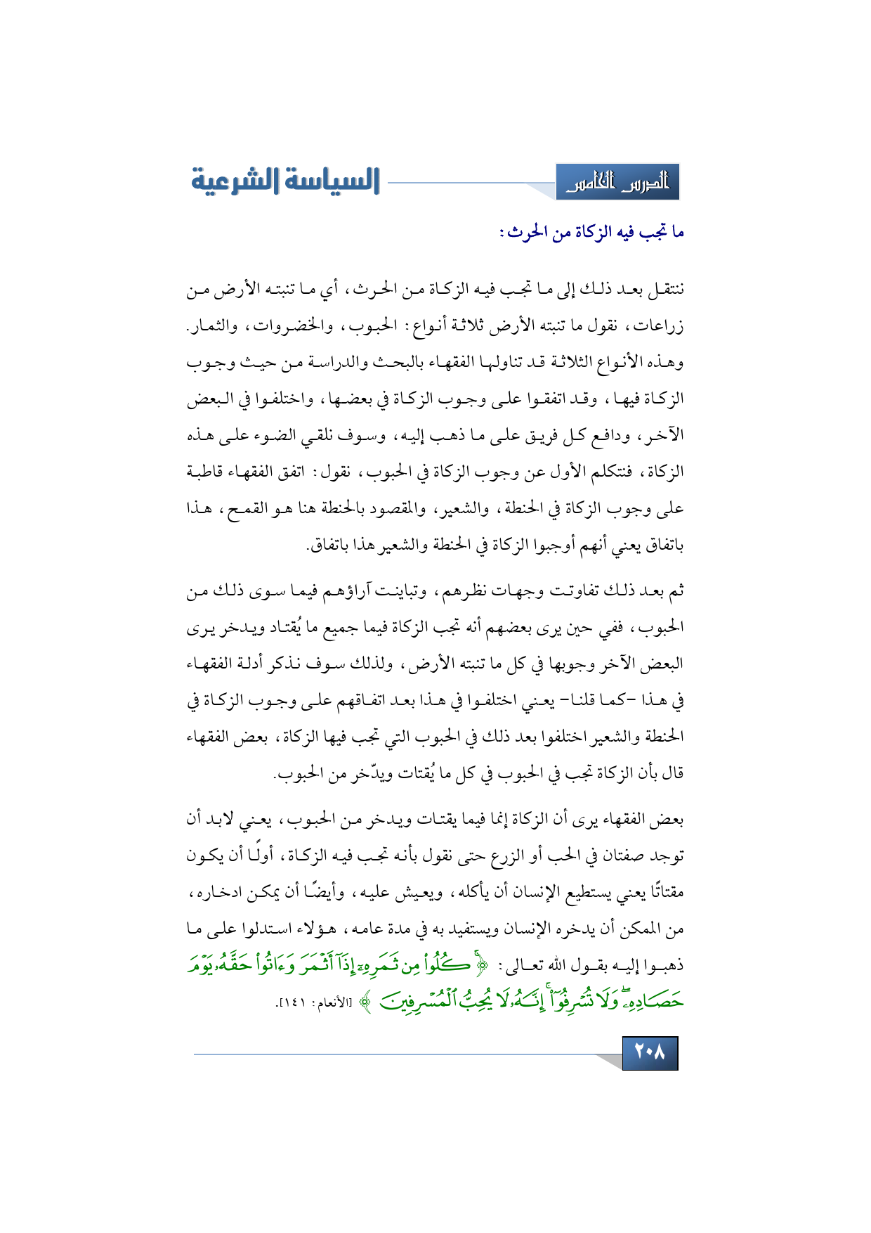 بعض الفقهاء أن الزكاة إنما فيما يقتات ويدخر من الحبوب، يعني لابد أن توجد صفتان في الحب أو الزرع حتى نقول بأنه تجب فيه الزكاة، أولًا أن يكون مقتاتًا يعني يستطيع الإنسان أن يأكله، ويعيش عليه، وأيضًا أن يمكن ادخاره، من الممكن أن يدخره الإنسان ويستفيد به في مدة عامه، هؤلاء استدلوا على ما ذهبوا إليه بقول الله تعالى: {كُلُوا مِنْ ثَمَرِهِ إِذَا أَثْمَرَ وَآتُوا حَقَّهُ يَوْمَ حَصَادِهِ} (الأنعام: من الآية: 141).