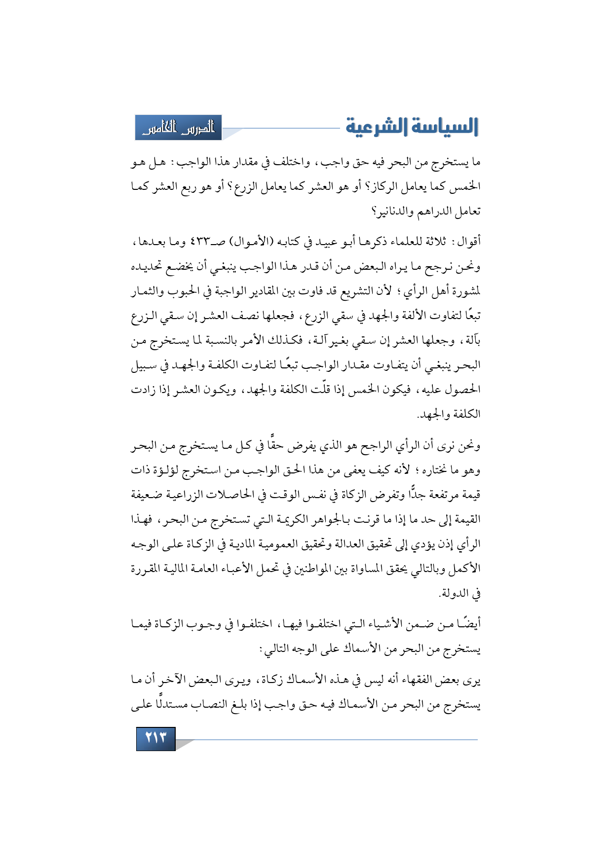 ونحن نرى أن الرأي الراجح هو الذي يفرض حقًّا في كل ما يستخرج من البحر وهو ما نختاره؛ لأنه كيف يعفى من هذا الحق الواجب من استخرج لؤلؤة ذات قيمة مرتفعة جدًّا وتفرض الزكاة في نفس الوقت في الحاصلات الزراعية ضعيفة القيمة إلى حد ما إذا ما قرنت بالجواهر الكريمة التي تستخرج من البحر، فهذا الرأي إذن يؤدي إلى تحقيق العدالة وتحقيق العمومية المادية في الزكاة على الوجه الأكمل وبالتالي يحقق المساواة بين المواطنين في تحمل الأعباء العامة المالية المقررة في الدولة.