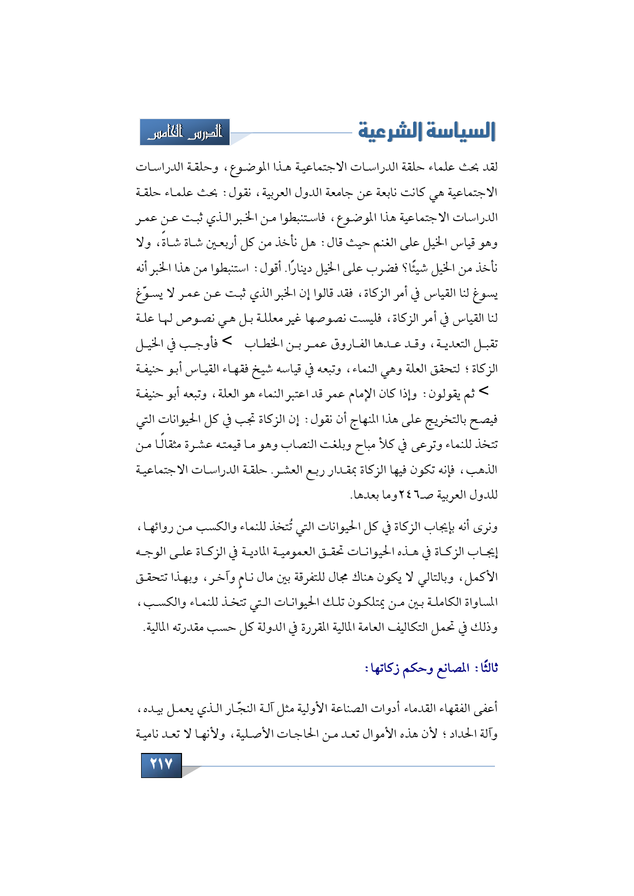 لقد بحث علماء حلقة الدراسات الاجتماعية هذا الموضوع، وحلقة الدراسات الاجتماعية هي كانت نابعة عن جامعة الدول العربية، نقول: بحث علماء حلقة الدراسات الاجتماعية هذا الموضوع، فاستنبطوا من الخبر الذي ثبت عن عمر وهو قياس الخيل على الغنم حيث قال: أفنأخذ من كل أربعين شاة شاةً، ولا نأخذ من الخيل شيئًا؟ فضرب على الخيل دينارًا. أقول: استنبطوا من هذا الخبر أنه يسوغ لنا القياس في أمر الزكاة، فقد قالوا إن الخبر الذي ثبت عن عمر لا يسوّغ لنا القياس في أمر الزكاة، فليست نصوصها غير معللة بل هي نصوص لها علة تقبل التعدية، وقد عدها الفاروق عمر بن الخطاب -رضي الله عنه- فأوجب في الخيل الزكاة؛ لتحقق العلة وهي النماء، وتبعه في قياسه شيخ فقهاء القياس أبو حنيفة -رضي الله عنه- ثم يقولون: وإذا كان الإمام عمر قد اعتبر النماء هو العلة، وتبعه أبو حنيفة فيصح بالتخريج على هذا المنهاج أن نقول: إن الزكاة تجب في كل الحيوانات التي تتخذ للنماء وترعى في كلأ مباح وبلغت النصاب وهو ما قيمته عشرة مثقالًا من الذهب، فإنه تكون فيها الزكاة بمقدار ربع العشر. حلقة الدراسات الاجتماعية للدول العربية صـ246وما بعدها.