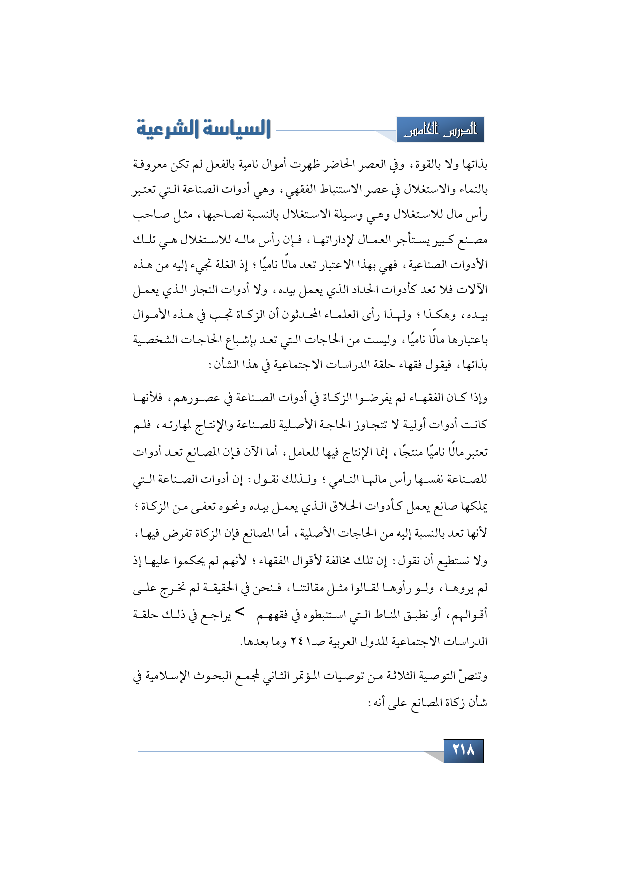 بذاتها ولا بالقوة، وفي العصر الحاضر ظهرت أموال نامية بالفعل لم تكن معروفة بالنماء والاستغلال في عصر الاستنباط الفقهي، وهي أدوات الصناعة التي تعتبر رأس مال للاستغلال وهي وسيلة الاستغلال بالنسبة لصاحبها، مثل صاحب مصنع كبير يستأجر العمال لإداراتها، فإن رأس ماله للاستغلال هي تلك الأدوات الصناعية، فهي بهذا الاعتبار تعد مالًا ناميًا؛ إذ الغلة تجيء إليه من هذه الآلات فلا تعد كأدوات الحداد الذي يعمل بيده، ولا أدوات النجار الذي يعمل بيده، وهكذا؛ ولهذا رأى العلماء المحدثون أن الزكاة تجب في هذه الأموال باعتبارها مالًا ناميًا، وليست من الحاجات التي تعد بإشباع الحاجات الشخصية بذاتها، فيقول فقهاء حلقة الدراسات الاجتماعية في هذا الشأن: