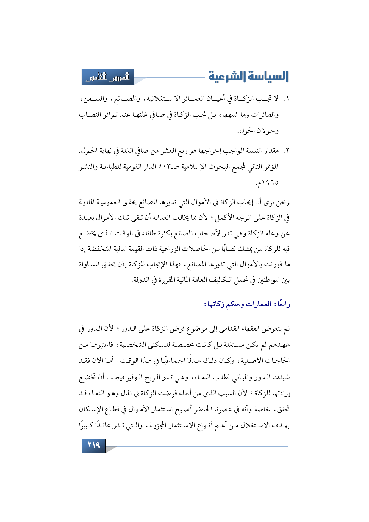 رابعًا: أيضًا من الأمور التي صار بشأنها التساؤل: العمارات، وحكم زكاتها لم يتعرض الفقهاء القدامى إلى موضوع فرض الزكاة على الدور؛ لأن الدور في عهدهم لم تكن مستغلة بل كانت مخصصة للسكنى الشخصية، فاعتبرها من الحاجات الأصلية، وكان ذلك عدلًا اجتماعيًا في هذا الوقت، أما الآن فقد شيدت الدور والمباني لطلب النماء، وهي تدر الربح الوفير فيجب أن تخضع إرادتها للزكاة؛ لأن السبب الذي من أجله فرضت الزكاة في المال وهو النماء قد تحقق، خاصة وأنه في عصرنا الحاضر أصبح استثمار الأموال في قطاع الإسكان بهدف الاستغلال من أهم أنواع الاستثمار المجزية، والتي تدر عائدًا كبيرًا