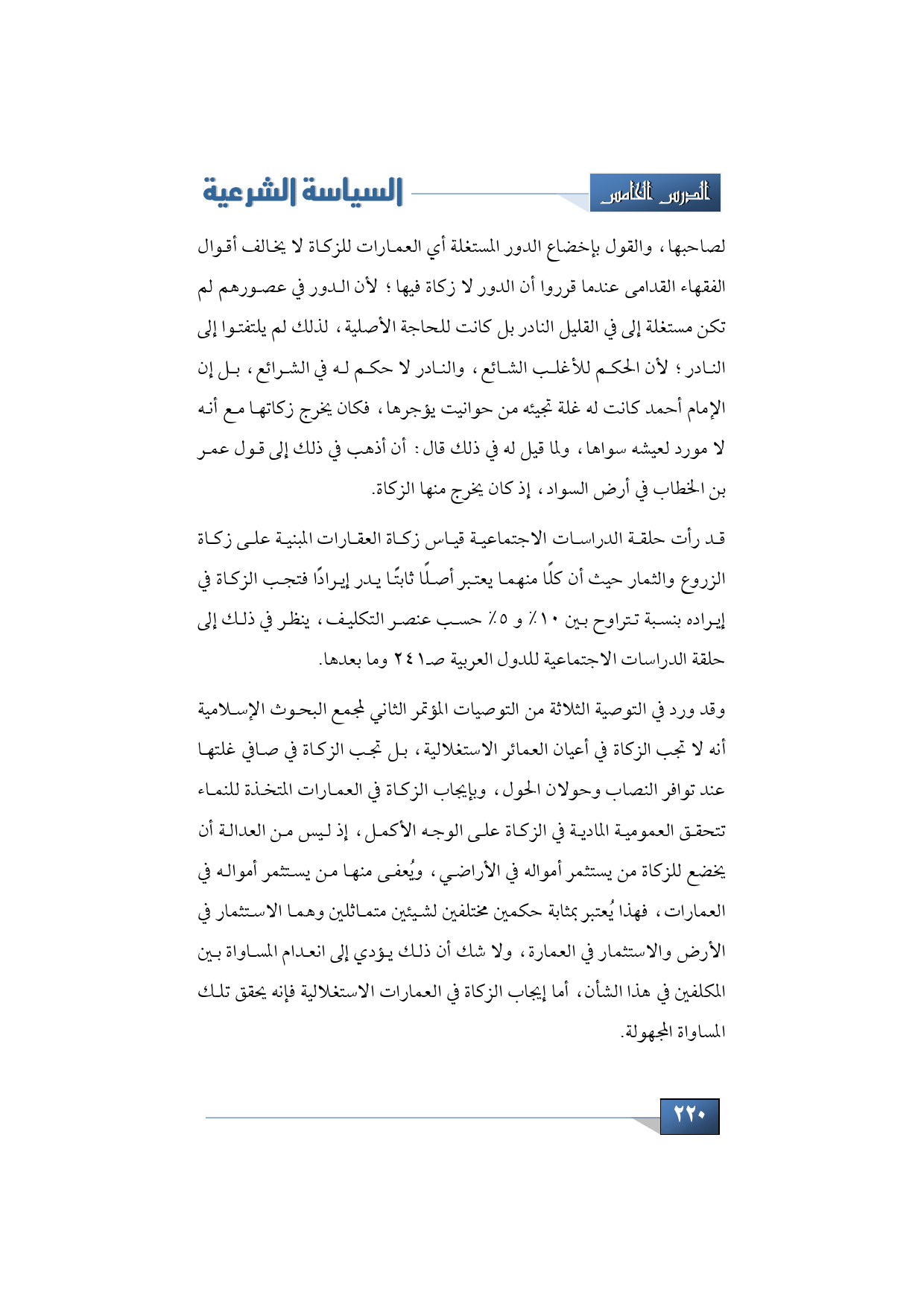 لصاحبها، والقول بإخضاع الدور المستغلة أي العمارات للزكاة لا يخالف أقوال الفقهاء القدامى عندما قرروا أن الدور لا زكاة فيها؛ لأن الدور في عصورهم لم تكن مستغلة إلى في القليل النادر بل كانت للحاجة الأصلية، لذلك لم يلتفتوا إلى النادر؛ لأن الحكم للأغلب الشائع، والنادر لا حكم له في الشرائع، بل إن الإمام أحمد كانت له غلة تجيئه من حوانيت يؤجرها، فكان يخرج زكاتها مع أنه لا مورد لعيشه سواها، ولما قيل له في ذلك قال: أن أذهب في ذلك إلى قول عمر بن الخطاب في أرض السواد، إذ كان يخرج منها الزكاة.