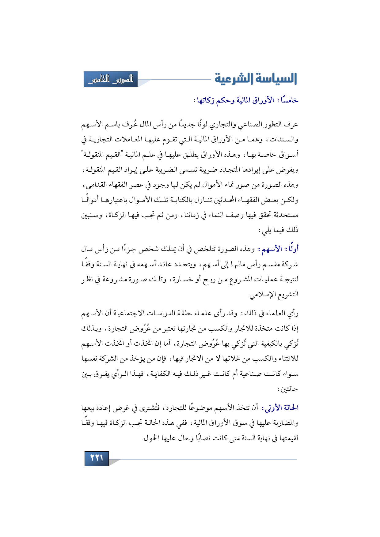خامسًا: أما بالنسبة أيضًا للأشياء التي فيها كلام الأوراق المالية وحكم زكاتها نقول: عرف التطور الصناعي والتجاري لونًا جديدًا من رأس المال عُرف باسم الأسهم والسندات، وهما من الأوراق المالية التي تقوم عليها المعاملات التجارية في أسواق خاصة بها، وهذه الأوراق يطلق عليها في علم المالية "القيم المنقولة" ويفرض على إيرادها المتجدد ضريبة تسمى الضريبة على إيراد القيم المنقولة، وهذه الصورة من صور نماء الأموال لم يكن لها وجود في عصر الفقهاء القدامى، ولكن بعض الفقهاء المحدثين تناول بالكتابة تلك الأموال باعتبارها أموالًا مستحدثة تحقق فيها وصف النماء في زماننا، ومن ثم تجب فيها الزكاة، وسنبين ذلك فيما يلي: