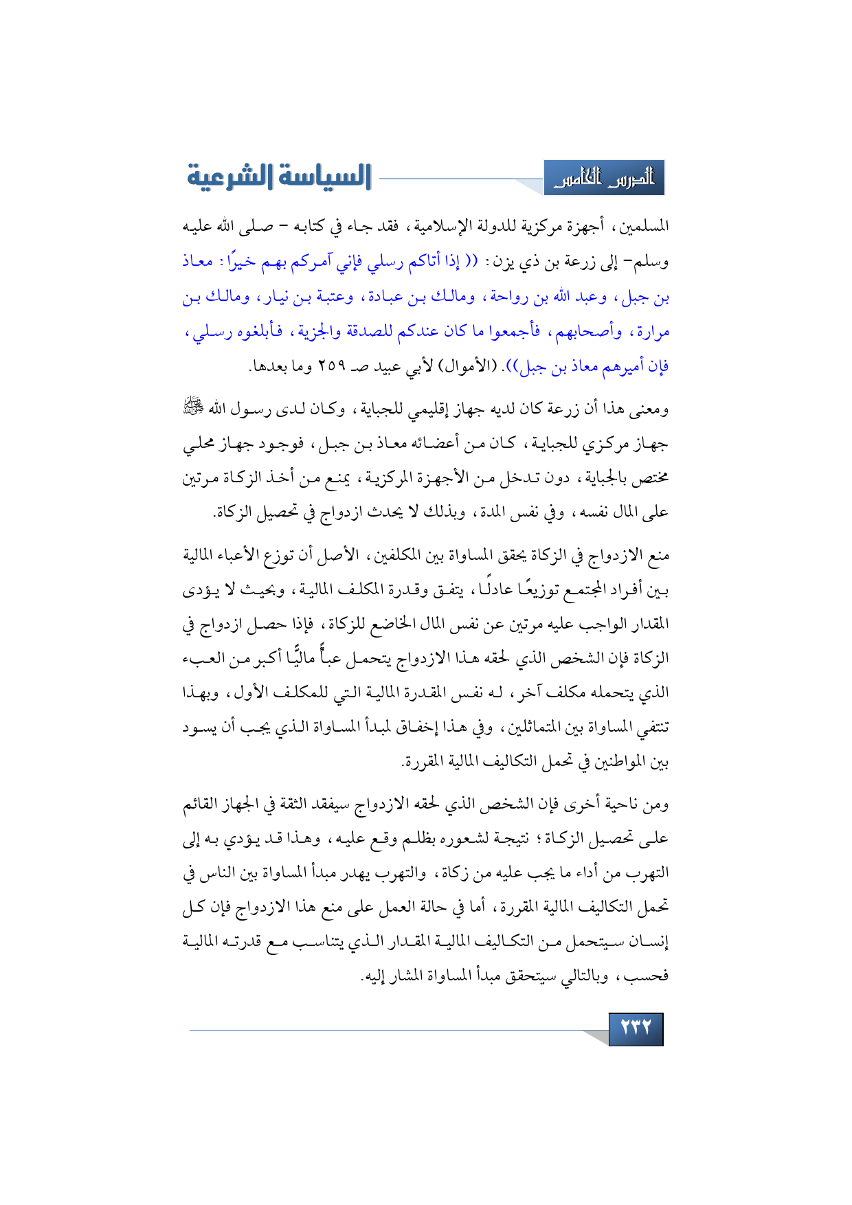 ومعنى هذا أن زرعة كان لديه جهاز إقليمي للجباية, وكان لدى رسول الله -صلى الله عليه وسلم- جهاز مركزي للجباية, كان من أعضائه معاذ بن جبل, فوجود جهاز محلي مختص بالجباية, دون تدخل من الأجهزة المركزية, يمنع من أخذ الزكاة مرتين على المال نفسه, وفي نفس المدة, وبذلك لا يحدث ازدواج في تحصيل الزكاة.