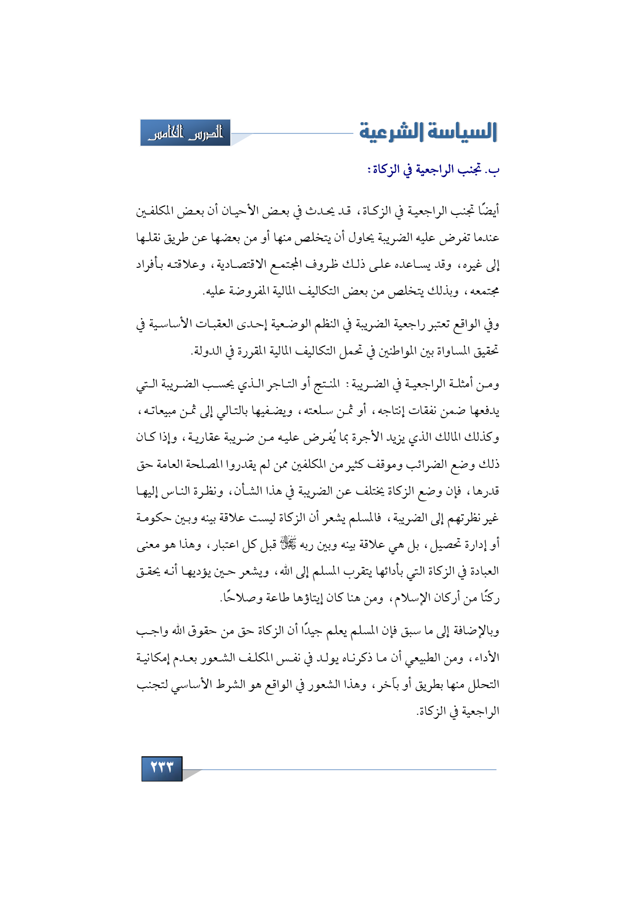 ومن أمثلة الراجعية في الضريبة: المنتج أو التاجر الذي يحسب الضريبة التي يدفعها ضمن نفقات إنتاجه, أو ثمن سلعته, ويضفيها بالتالي إلى ثمن مبيعاته, وكذلك المالك الذي يزيد الأجرة بما يُفرض عليه من ضريبة عقارية, وإذا كان ذلك وضع الضرائب وموقف كثير من المكلفين ممن لم يقدروا المصلحة العامة حق قدرها, فإن وضع الزكاة يختلف عن الضريبة في هذا الشأن, ونظرة الناس إليها غير نظرتهم إلى الضريبة, فالمسلم يشعر أن الزكاة ليست علاقة بينه وبين حكومة أو إدارة تحصيل, بل هي علاقة بينه وبين ربه -سبحانه وتعالى- قبل كل اعتبار, وهذا هو معنى العبادة في الزكاة التي بأدائها يتقرب المسلم إلى الله, ويشعر حين يؤديها أنه يحقق ركنًا من أركان الإسلام, ومن هنا كان إيتاؤها طاعة وصلاحًا.