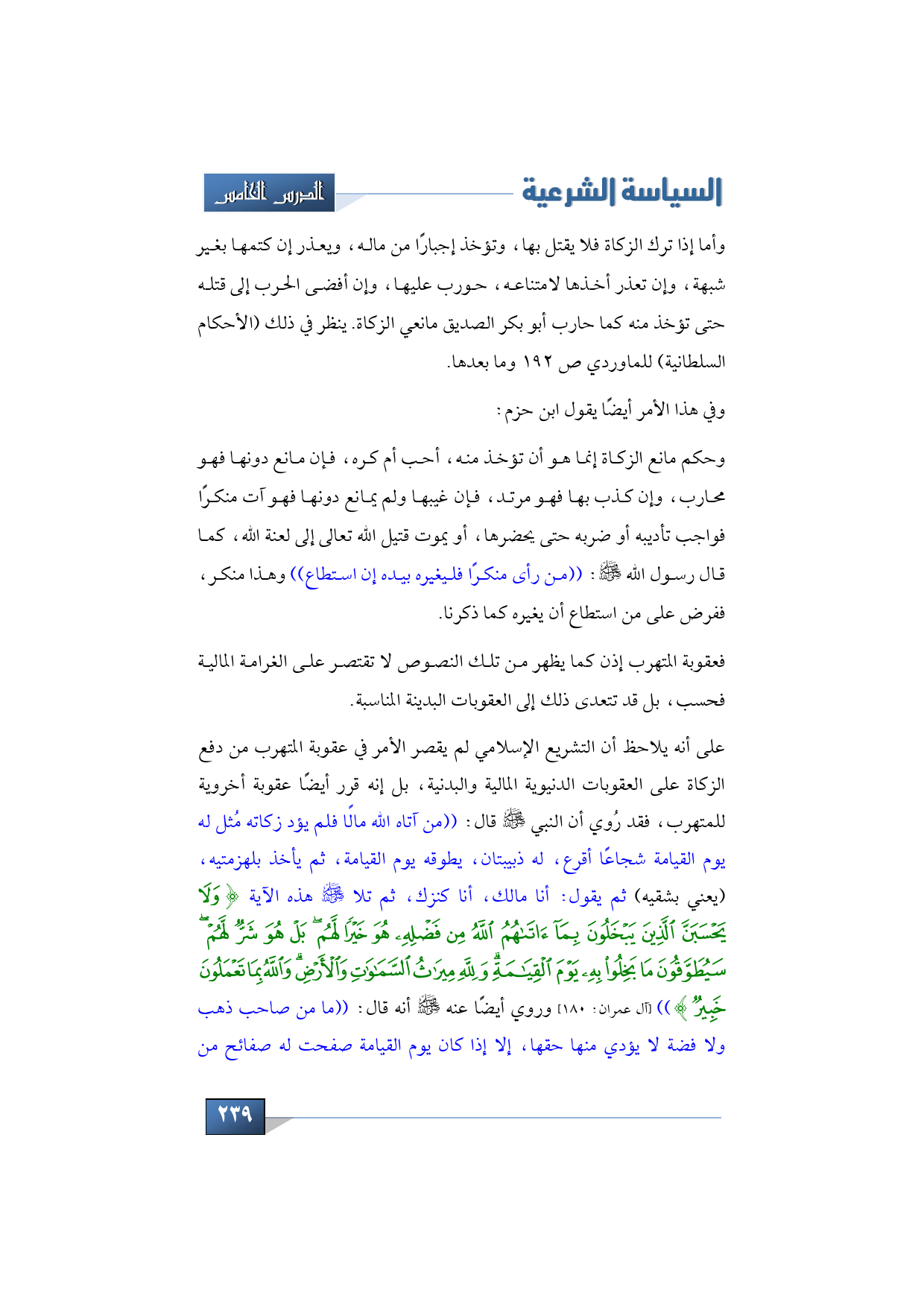 على أنه يلاحظ أن التشريع الإسلامي لم يقصر الأمر في عقوبة المتهرب من دفع الزكاة على العقوبات الدنيوية المالية والبدنية, بل إنه قرر أيضًا عقوبة أخروية للمتهرب, فقد رُوي أن النبي -صلى الله عليه وسلم- قال: ((من آتاه الله مالًا فلم يؤد زكاته مُثل له يوم القيامة شجاعًا أقرع, له ذبيبتان, يطوقه يوم القيامة, ثم يأخذ بلهزمتيه, (يعني بشقيه) ثم يقول: أنا مالك, أنا كنزك, ثم تلا -صلى الله عليه وسلم- هذه الآية {وَلا يَحْسَبَنَّ الَّذِينَ يَبْخَلُونَ بِمَا آتَاهُمْ اللَّهُ مِنْ فَضْلِهِ هُوَ خَيْرًا لَهُمْ بَلْ هُوَ شَرٌّ لَهُمْ سَيُطَوَّقُونَ مَا بَخِلُوا بِهِ يَوْمَ الْقِيَامَةِ})) (آل عمران: من الآية: 180) وروي أيضًا عنه -صلى الله عليه وسلم- أنه قال: ((ما من صاحب ذهب ولا فضة لا يؤدي منها حقها, إلا إذا كان يوم القيامة صفحت له صفائح من
