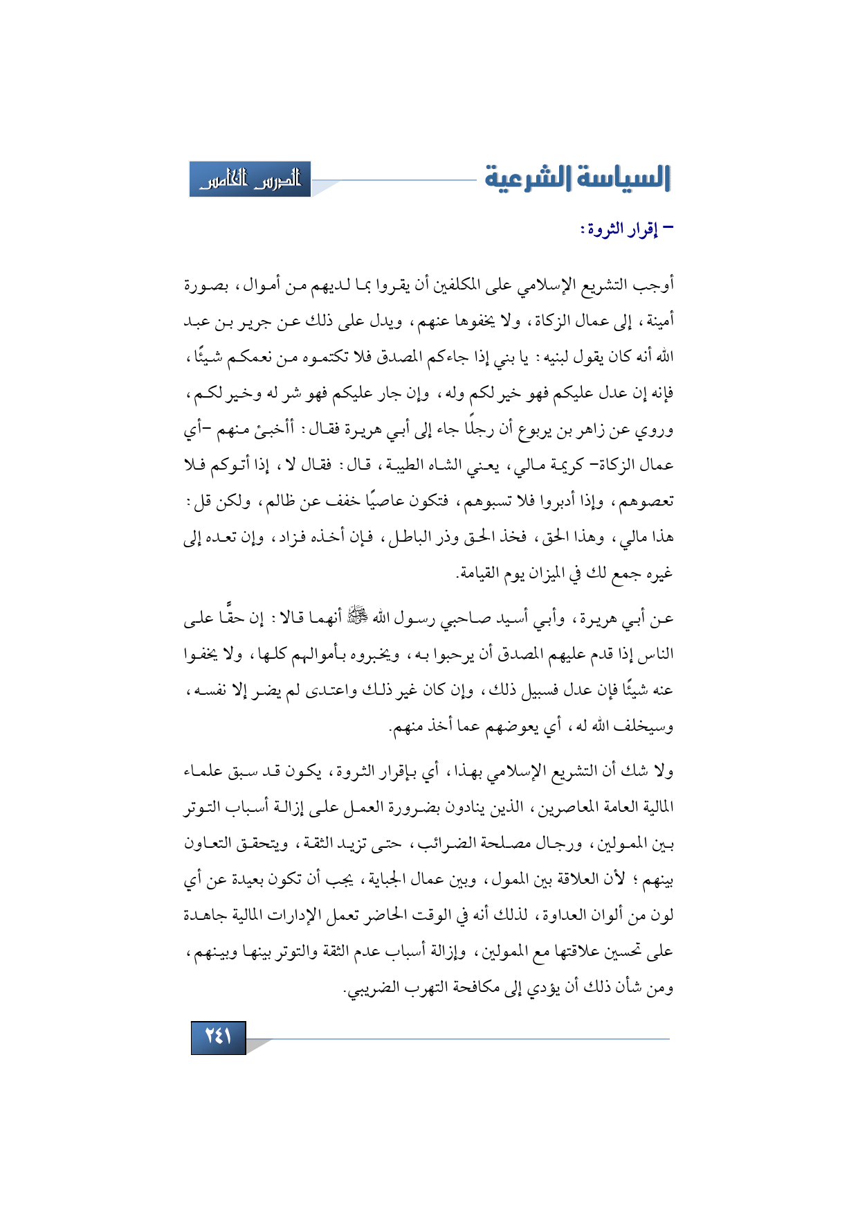ولا شك أن التشريع الإسلامي بهذا, أي بإقرار الثروة, يكون قد سبق علماء المالية العامة المعاصرين, الذين ينادون بضرورة العمل على إزالة أسباب التوتر بين الممولين, ورجال مصلحة الضرائب, حتى تزيد الثقة, ويتحقق التعاون بينهم؛ لأن العلاقة بين الممول, وبين عمال الجباية, يجب أن تكون بعيدة عن أي لون من ألوان العداوة, لذلك أنه في الوقت الحاضر تعمل الإدارات المالية جاهدة على تحسين علاقتها مع الممولين, وإزالة أسباب عدم الثقة والتوتر بينها وبينهم, ومن شأن ذلك أن يؤدي إلى مكافحة التهرب الضريبي.