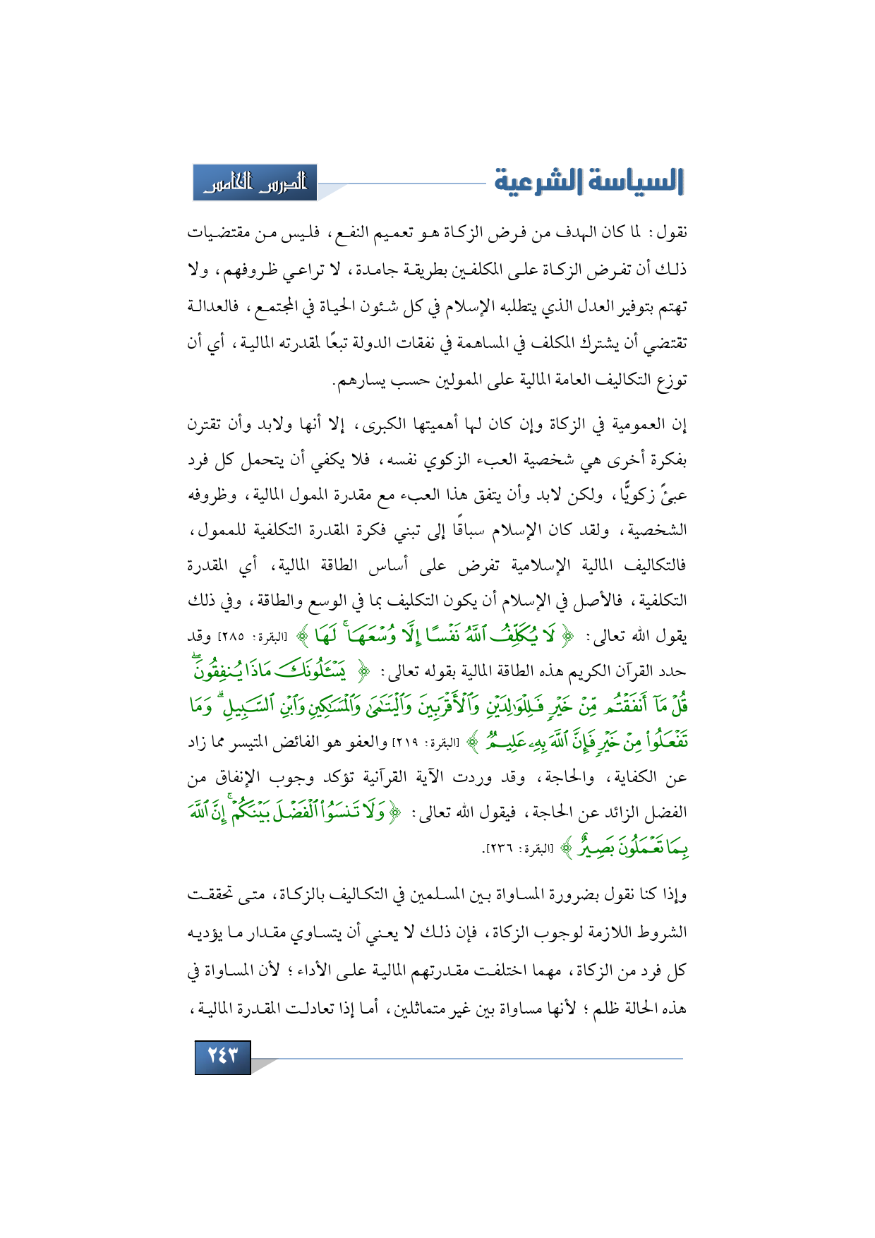 نقول: لما كان الهدف من فرض الزكاة هو تعميم النفع, فليس من مقتضيات ذلك أن تفرض الزكاة على المكلفين بطريقة جامدة, لا تراعي ظروفهم, ولا تهتم بتوفير العدل الذي يتطلبه الإسلام في كل شئون الحياة في المجتمع, فالعدالة تقتضي أن يشترك المكلف في المساهمة في نفقات الدولة تبعًا لمقدرته المالية, أي أن توزع التكاليف العامة المالية على الممولين حسب يسارهم.