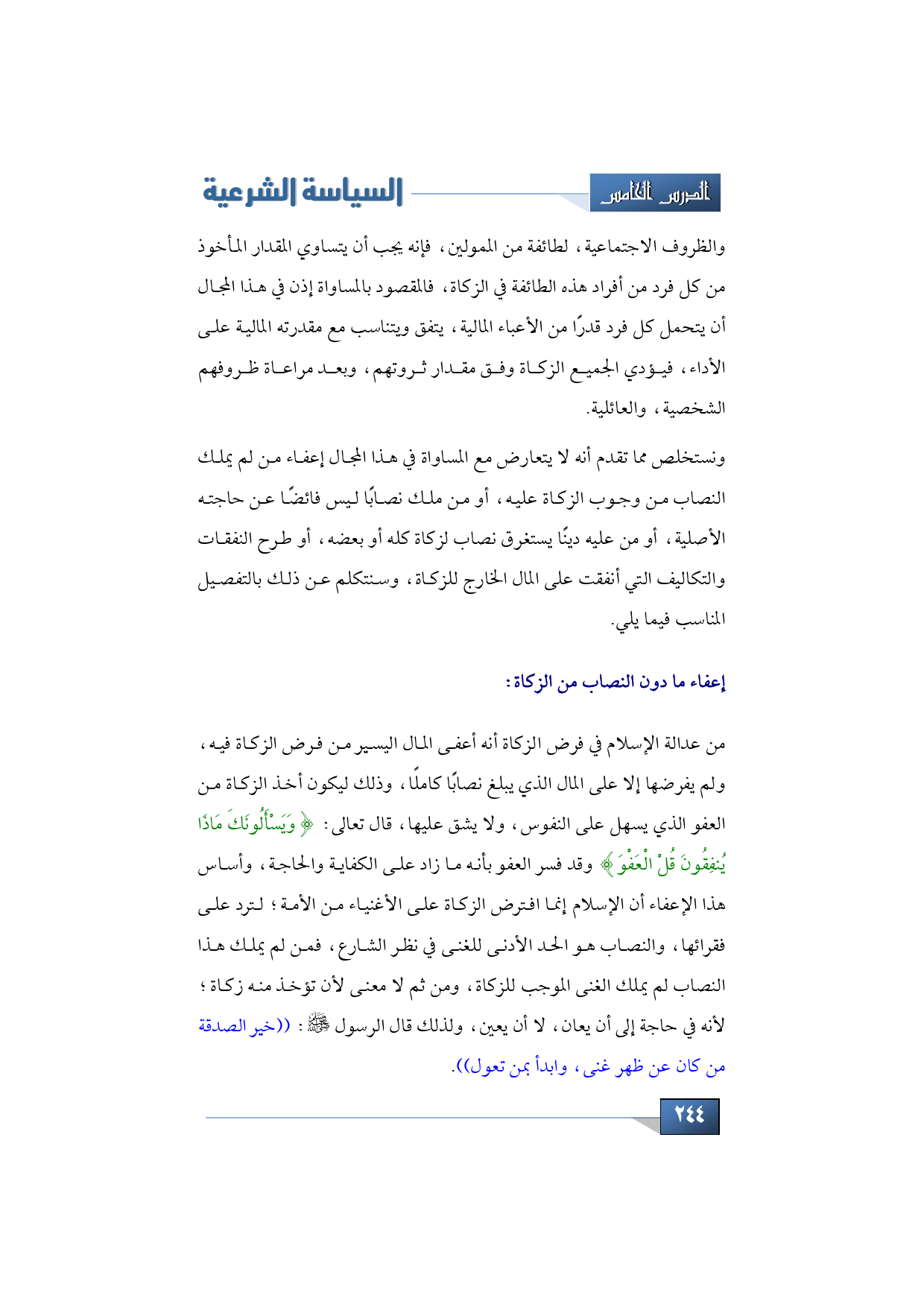 من عدالة الإسلام في فرض الزكاة أنه أعفى المال اليسير من فرض الزكاة فيه, ولم يفرضها إلا على المال الذي يبلغ نصابًا كاملًا, وذلك ليكون أخذ الزكاة من العفو الذي يسهل على النفوس, ولا يشق عليها, قال تعالى: {وَيَسْأَلُونَكَ مَاذَا يُنفِقُونَ قُلْ الْعَفْوَ} وقد فسر العفو بأنه ما زاد على الكفاية والحاجة, وأساس هذا الإعفاء أن الإسلام إنما افترض الزكاة على الأغنياء من الأمة؛ لترد على فقرائها, والنصاب هو الحد الأدنى للغنى في نظر الشارع, فمن لم يملك هذا النصاب لم يملك الغنى الموجب للزكاة, ومن ثم لا معنى لأن تؤخذ منه زكاة؛ لأنه في حاجة إلى أن يعان, لا أن يعين, ولذلك قال الرسول -صلى الله عليه وسلم- ((خير الصدقة من كان عن ظهر غنى, وابدأ بمن تعول)).