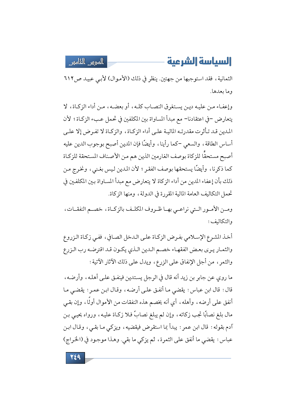 ما روي عن جابر بن زيد أنه قال في الرجل يستدين فينفق على أهله, وأرضه, قال: قال ابن عباس: يقضي ما أنفق على أرضه, وقال ابن عمر: يقضي ما أنفق على أرضه, وأهله, أي أنه يخصم هذه النفقات من الأموال أولًا, وإن بقي مال بلغ نصابًا تجب زكاته, وإن لم يبلغ نصابً فلا زكاة عليه, ورواه يحيي بن آدم بقوله: قال ابن عمر: يبدأ بما استقرض فيقضيه, ويزكي ما بقي, وقال ابن عباس: يقضي ما أنفق على الثمرة, ثم يزكي ما بقي. وهذا موجود في الخراج