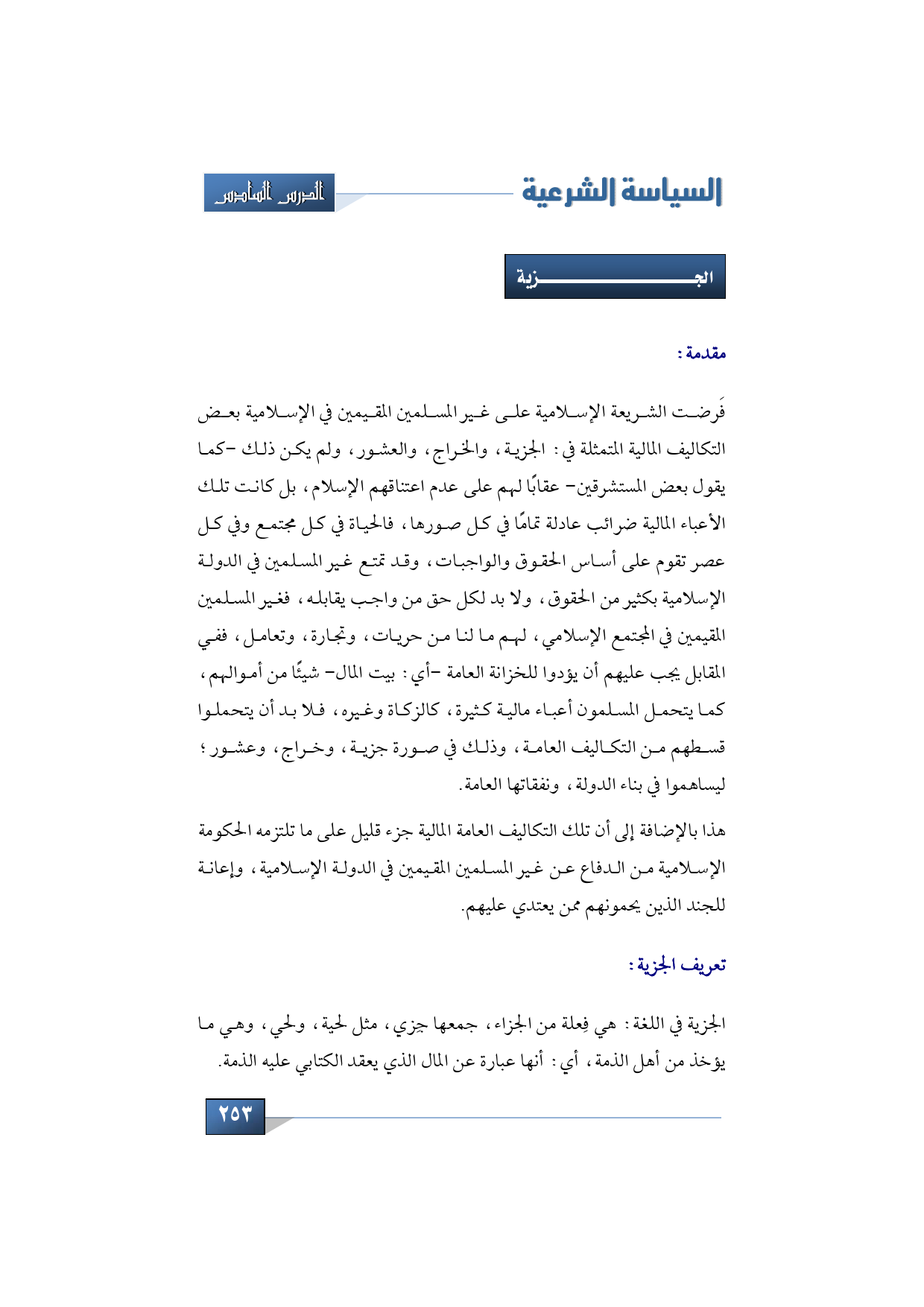فرضت الشريعة الإسلامية على غير المسلمين المقيمين في الإسلامية بعض التكاليف المالية المتمثلة في الجزية, والخراج, والعشور, ولم يكن ذلك -كما يقول بعض المستشرقين- لم يكن ذلك عقابًا لهم على عدم اعتناقهم الإسلام, بل كانت تلك الأعباء المالية ضرائب عادلة تمامً في كل صورها, فالحياة في كل مجتمع, في كل عصر تقوم على أساس الحقوق والواجبات, وقد تمتع غير المسلمين في الدولة الإسلامية بكثير من الحقوق, ولابد لكل حق من واجب يقابله, فغير المسلمين المقيمين في المجتمع الإسلامي, لهم ما لنا من حريات, وتجارة, وتعامل, ففي المقابل يجب عليهم أن يؤدوا للخزانة العامة -أي بيت المال- شيئًا من أموالهم, كما يتحمل المسلمون أعباء مالية كثيرة, كالزكاة وغيره, إنه لا بد أن يتحملوا قسطهم من التكاليف العامة, وذلك في صورة جزية, وخراج, وعشور؛ ليساهموا في بناء الدولة, ونفقاتها العامة, ومن الممكن الرجوع في هذا الموضوع إلى كتاب (الإسلام وأهل الذمة) دكتور علي حسن الخربطلي, لجنة التعريف بالإسلام, يصدرها المجلس الأعلى للشئون الإسلامية, كتاب رقم 49 لسنة 1969 صـ 67.